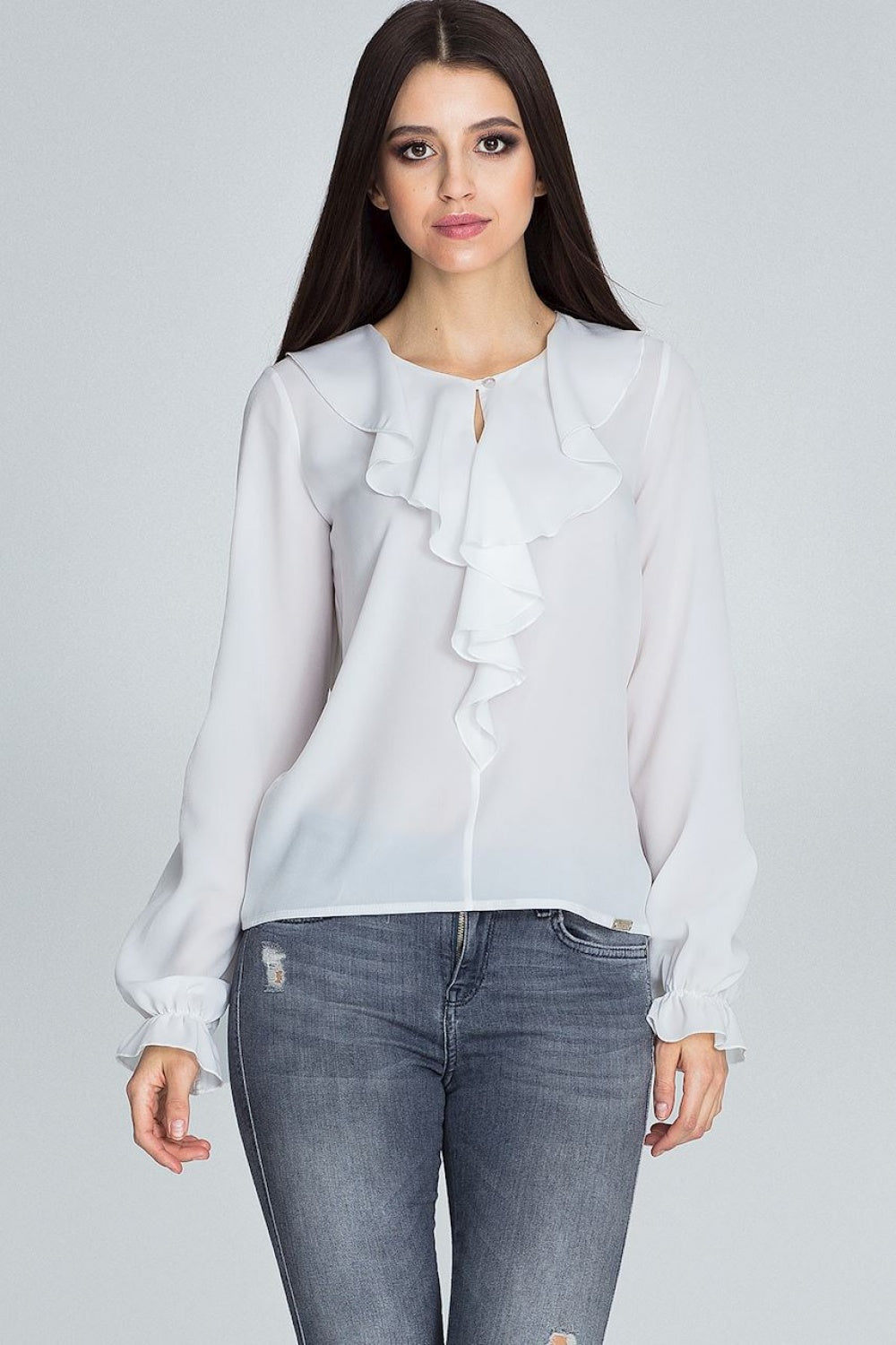 Una blusa elegante con chorrera abrochada con un delicado botón. Las mangas largas con volantes añaden definición y enfatizan la belleza de la feminidad. Una forma sencilla garantiza la comodidad de uso.