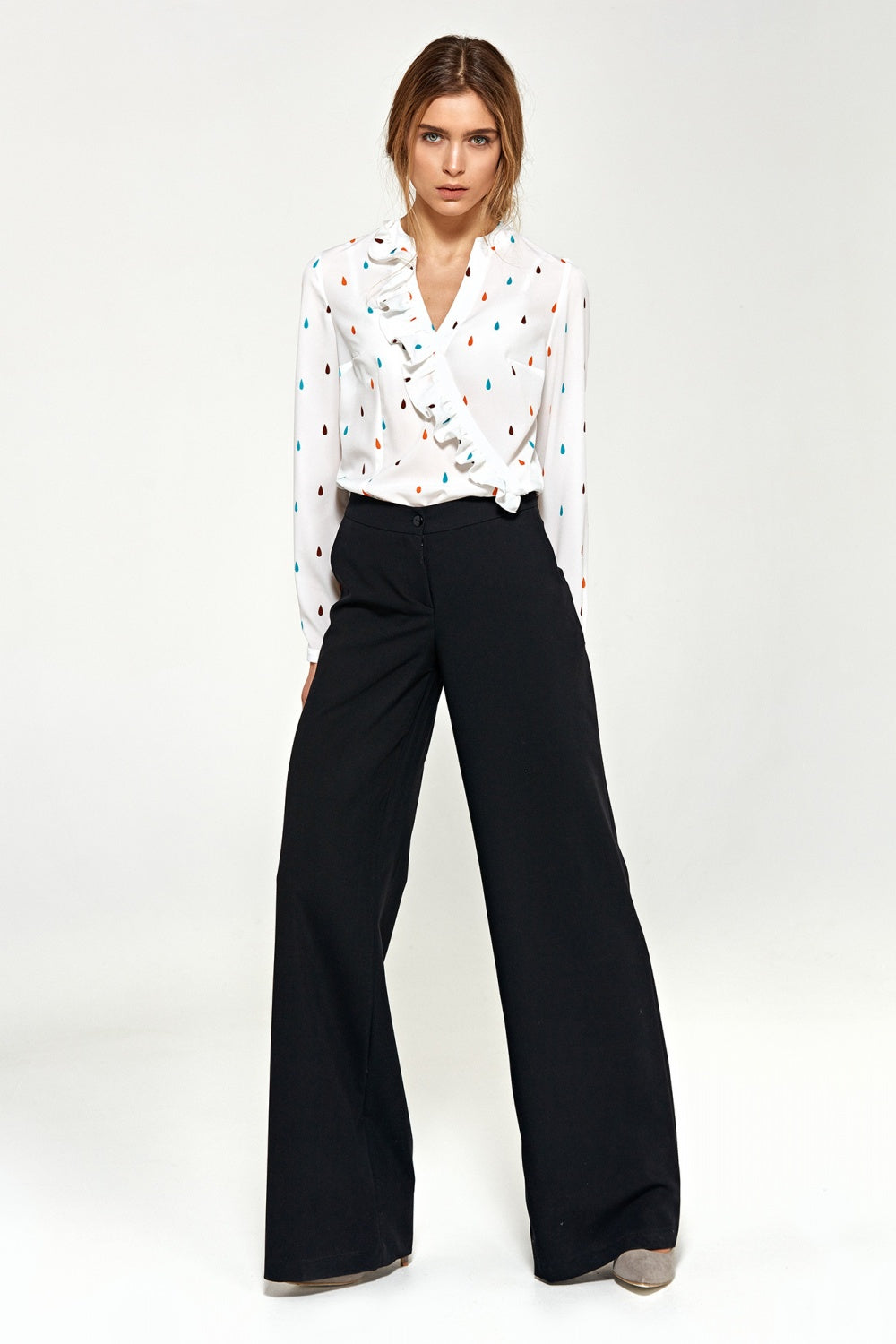 ¡Uno de los cortes de pantalón más trendy de la temporada! Pantalones de corte palazzo con perneras acampanadas y planchadas. El modelo cuenta con prácticos bolsillos.
