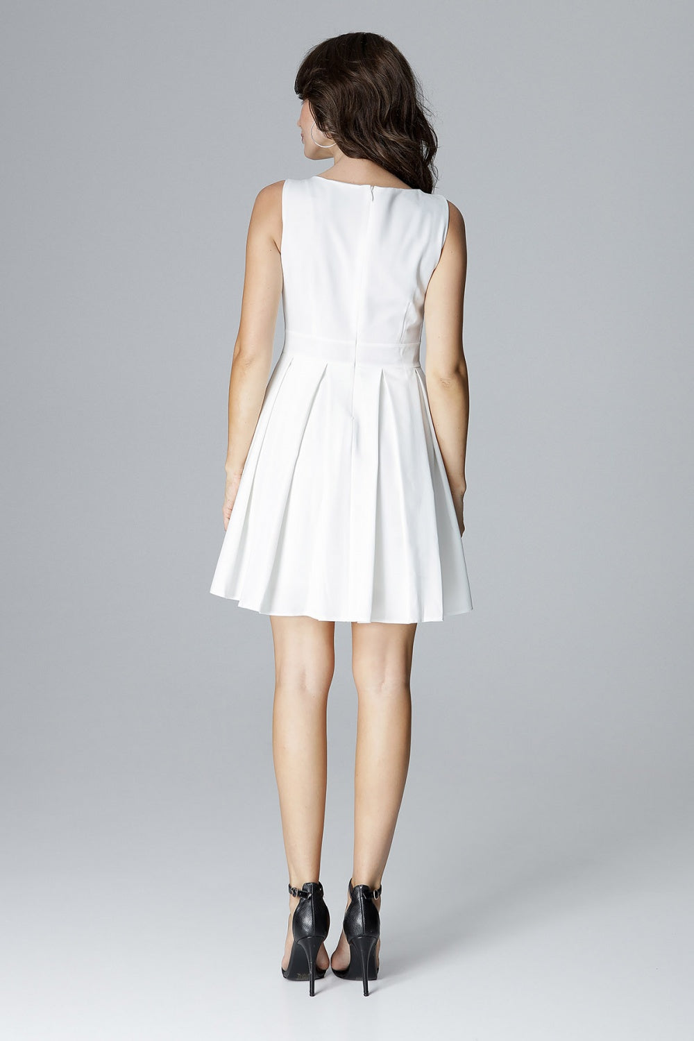 Vestido sin mangas. Con top ajustado y escote pronunciado y femenino. Modelo de corte a la cintura con bajo acampanado con amplios pliegues. El vestido realza y estiliza la cintura a la perfección.