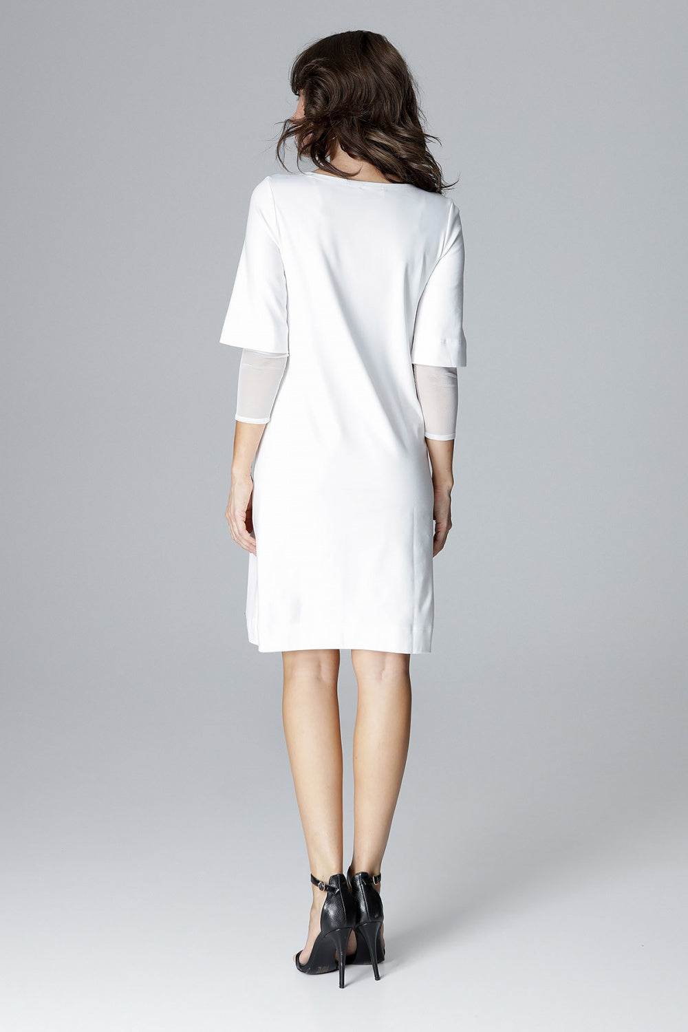 Corte sencillo, perfecto para todo tipo de figuras. Escote semicircular con inserción de malla transparente, mangas largas con efecto de doble capa desde el codo, con una transparencia a la moda.