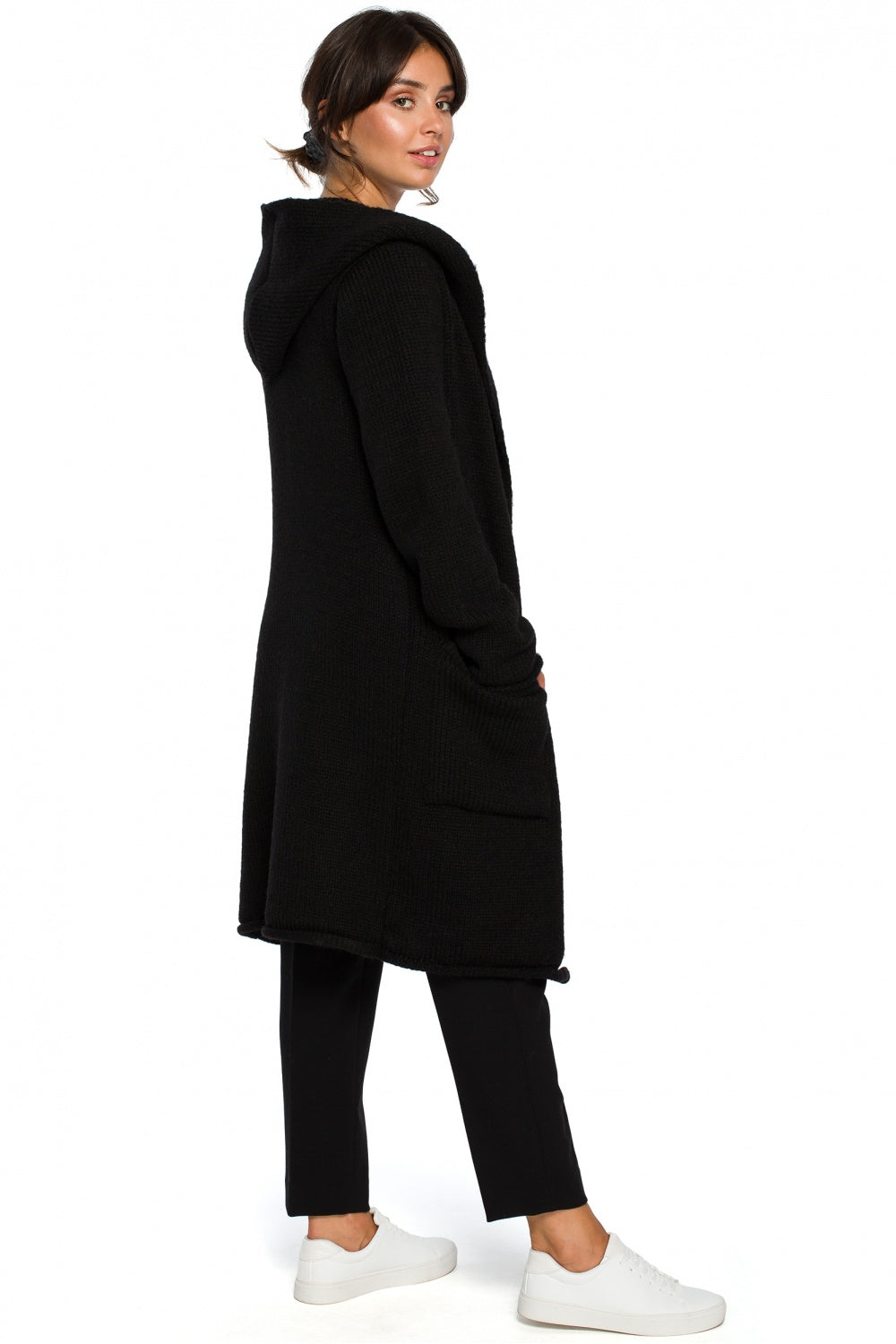 Cárdigan largo, cálido y desabrochado con capucha, ideal como prenda exterior para los días más fríos. Bolsillos delanteros.