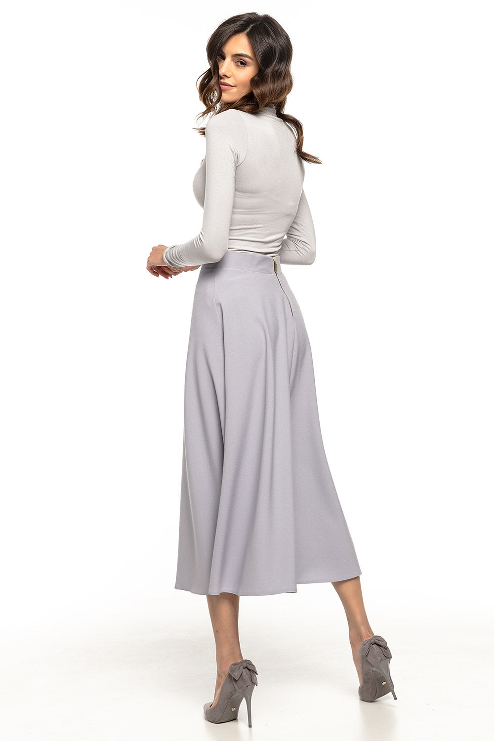 Preciosa falda midi de tela. Esta falda es nuestro guiño a la moda de los años 50. Su corte y la tela con la que está confeccionada le permiten moverse con elegancia. Además, puede usarse tanto para looks elegantes como informales, e incluso deportivos. ¡Hemos creado un imprescindible para toda mujer! La falda está rematada con un cinturón pegado y una cremallera decorativa.