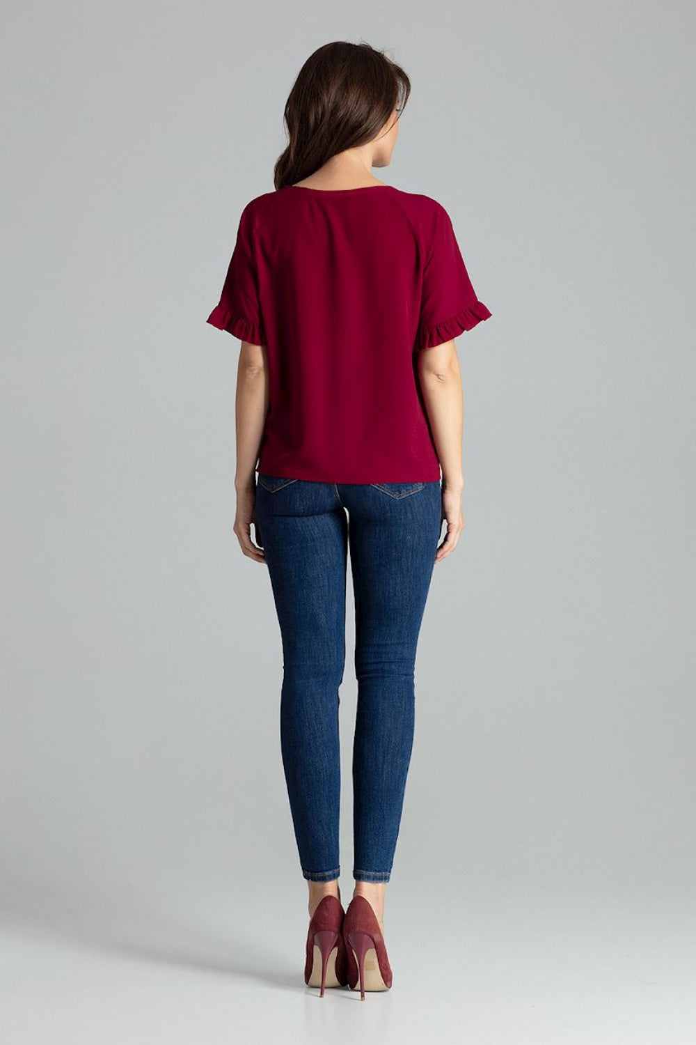 Blusa burdeos de corte recto con mangas cortas con volantes. Escote semicircular. Emblema metálico con el logo de la marca en el borde inferior izquierdo.