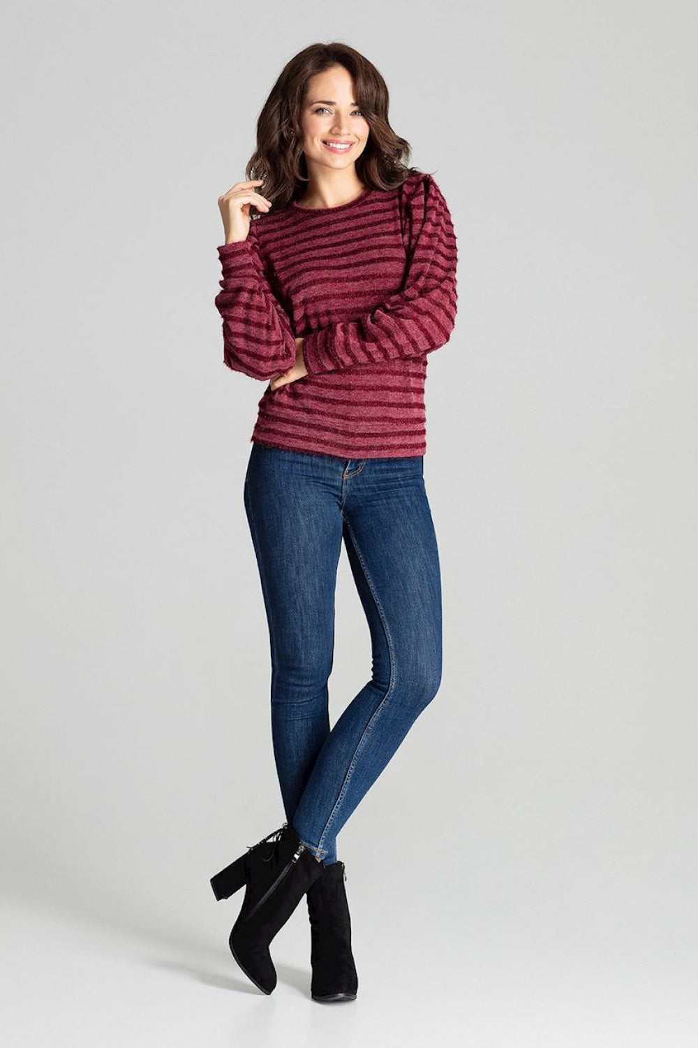 Blusa granate con mangas largas de kimono, tejida con rayas horizontales decorativas. Escote semicircular.