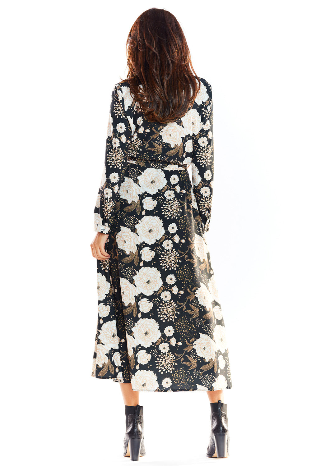 Un vestido maxi con parte superior camisera y bajo trapecio abotonado, con cinturón de color. ¡El vestido maxi imprescindible de esta temporada! Su estampado original le aporta originalidad. Ligero y vaporoso, perfecto para cualquier ocasión. Puedes llevarlo tanto con zapatillas deportivas como con botas de invierno.