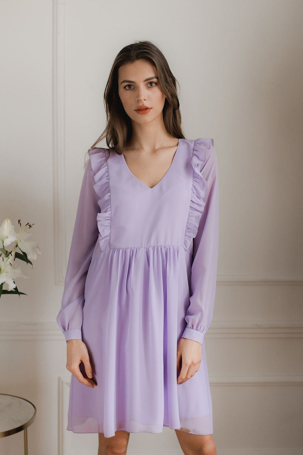 Vestido midi suelto morado de gasa con mangas largas con volantes y puños abotonados. Escote Serek. Volantes verticales decorativos cosidos en la parte delantera y trasera. Costuras en la cintura. Sin cierre. Bajo con combinación.