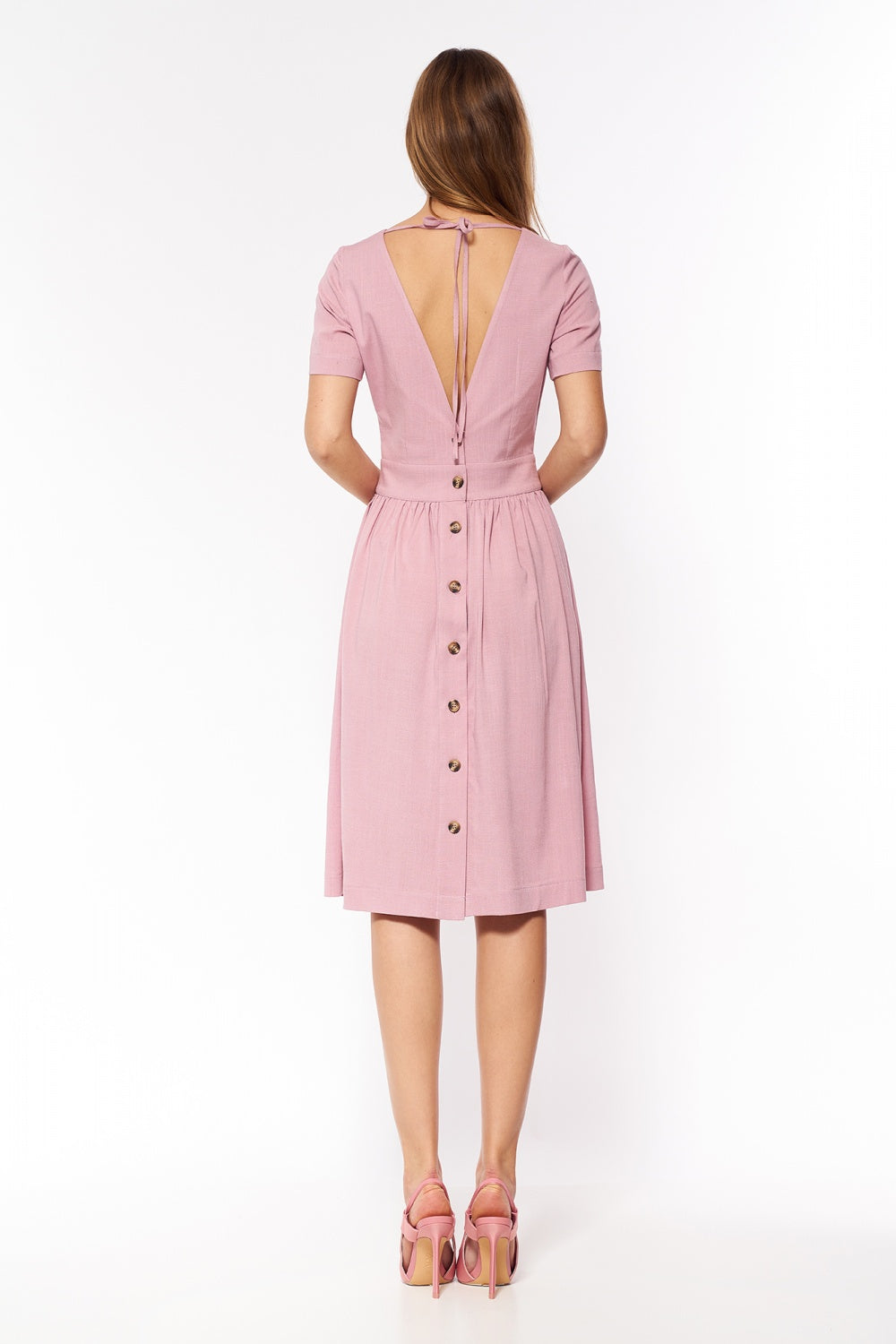 El vestido de viscosa sin espalda es imprescindible en el armario de verano de todos. Vestido muy femenino con escote en la espalda y cordón decorativo que evita que el vestido se deslice de los hombros. Una hilera de botones añade elegancia a este vestido único. Perfecto para los días cálidos. El vestido además tiene dos bolsillos en la parte delantera.