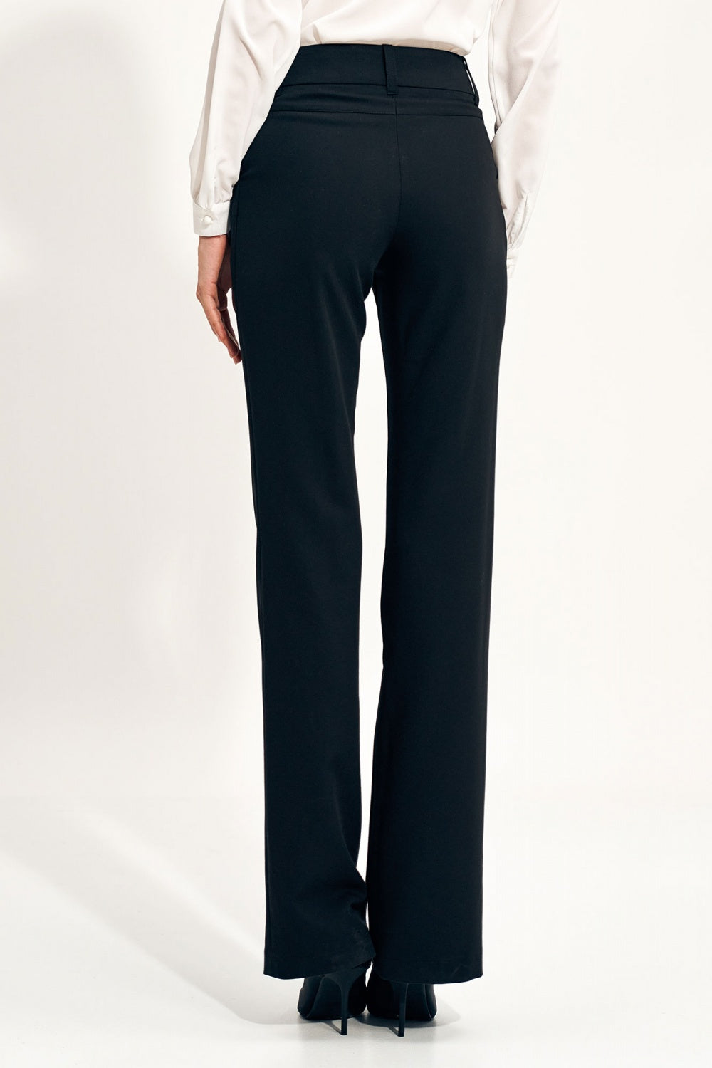 Pantalones acampanados clásicos. Su parte superior elevada con un panel cosido simula un cinturón ancho. Los pantalones tienen perneras acampanadas y un corte entallado que realza la figura y quedan perfectos con zapatos de tacón o plataforma. Junto con una chaqueta del mismo color, crean un elegante conjunto de estilo informal.