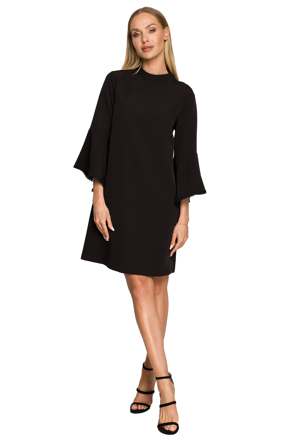 Un vestido con corte trapezoidal o en forma de A no solo aporta un toque femenino, sino que también ayuda a disimular las imperfecciones de la figura. Seguimos cuidando los detalles que lo hacen único: las mangas anchas con volantes estaban decoradas con una delicada cinta con ribete esférico. El vestido no tiene forro.