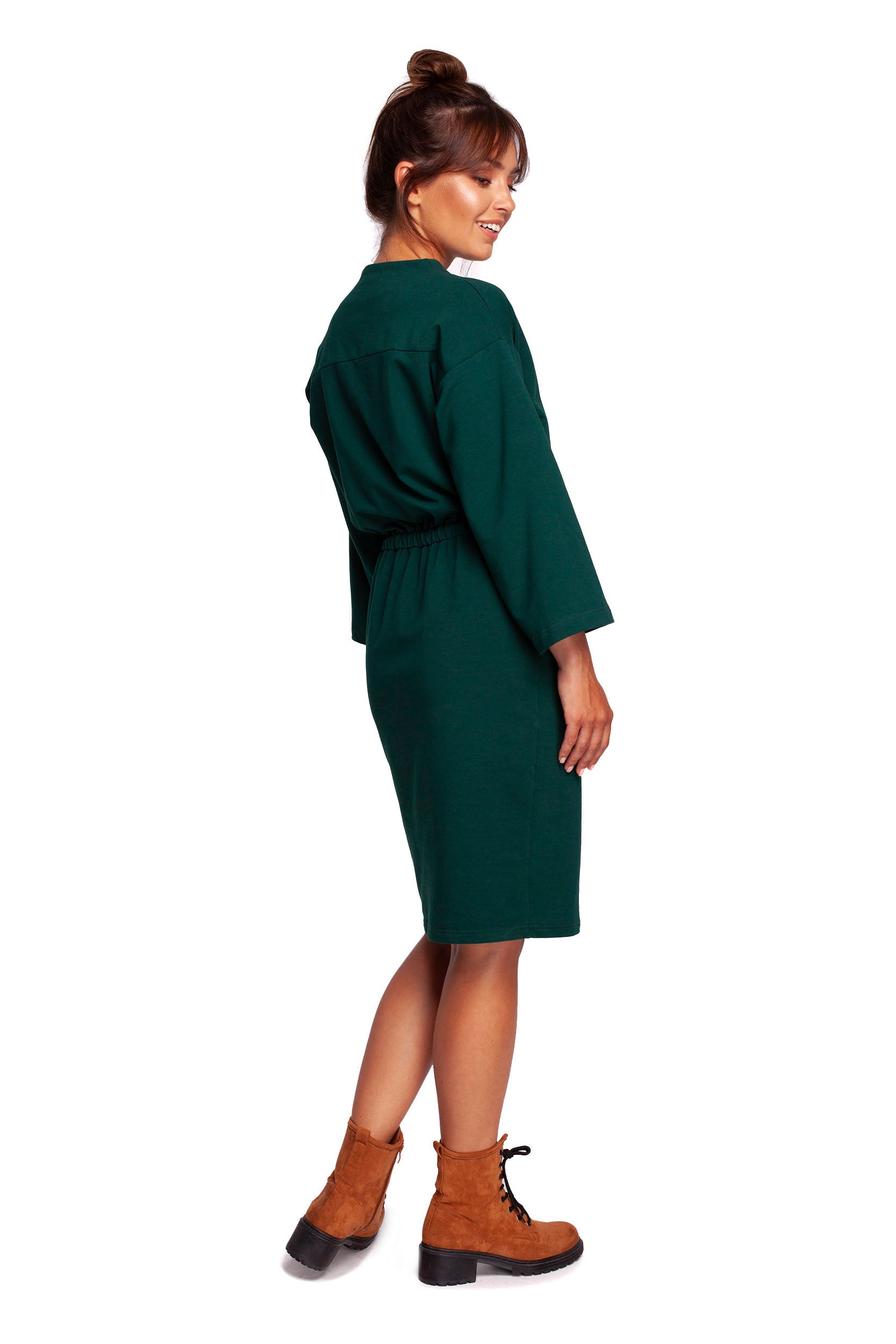 Elegante vestido de corte sencillo con escote en forma de lágrima y botones, con toques deportivos, pantalón recogido en la cintura y confeccionado en un tejido de punto suave y agradable. El vestido tiene mangas 3/4 y se lleva por la cabeza.