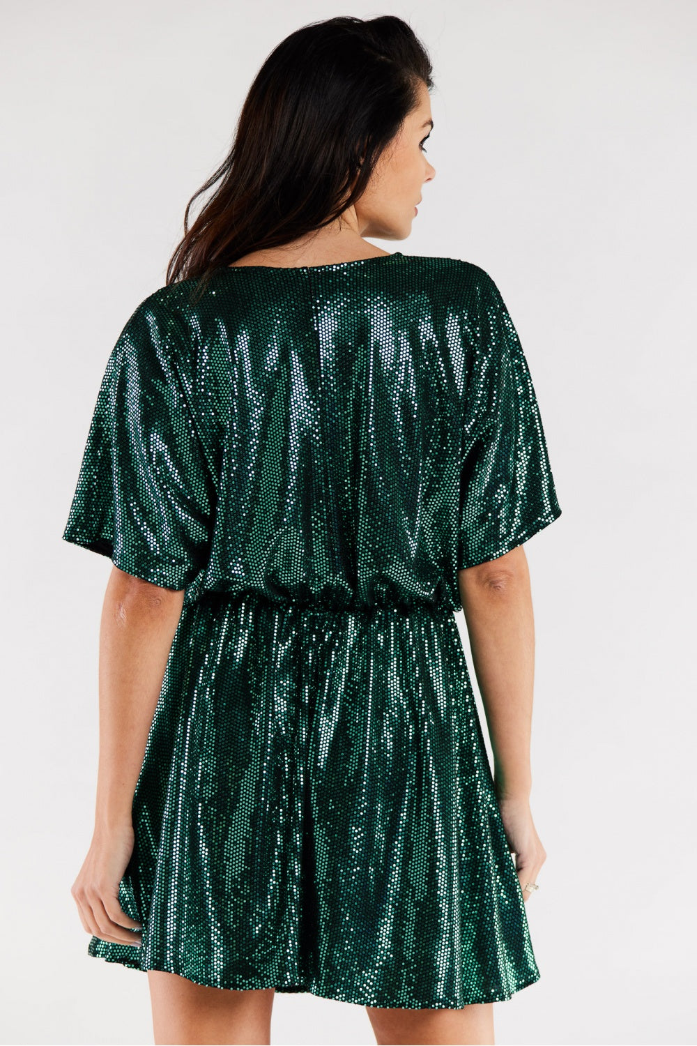 Vestido corto de vuelo con mangas cortas y escote corazón. La cintura está ajustada con una banda elástica. El vestido está cosido sobre un forro elástico. El vestido fue confeccionado en Polonia.