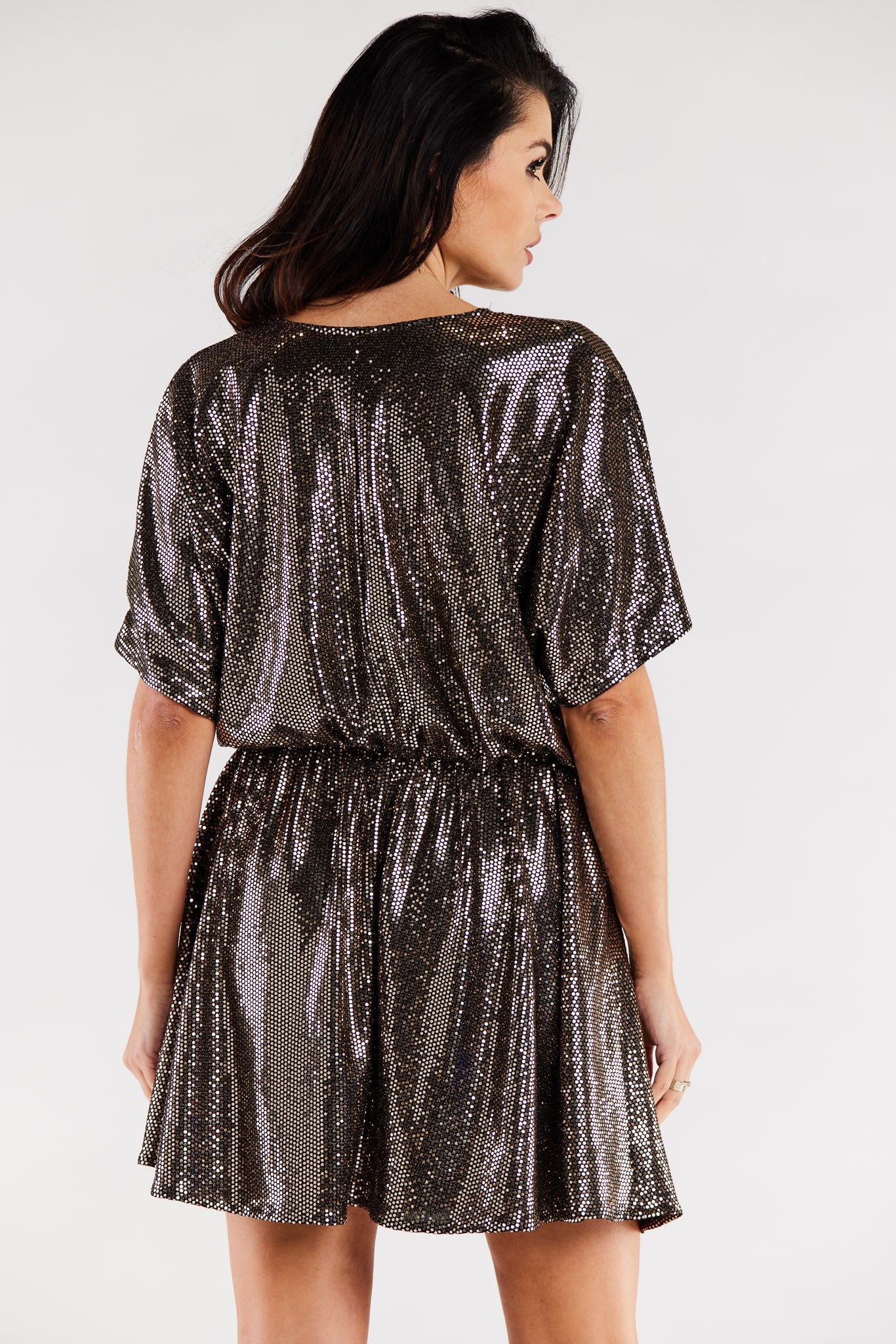 Vestido corto de vuelo con mangas cortas y escote corazón. La cintura está ajustada con una banda elástica. El vestido está cosido sobre un forro elástico. El vestido fue confeccionado en Polonia.
