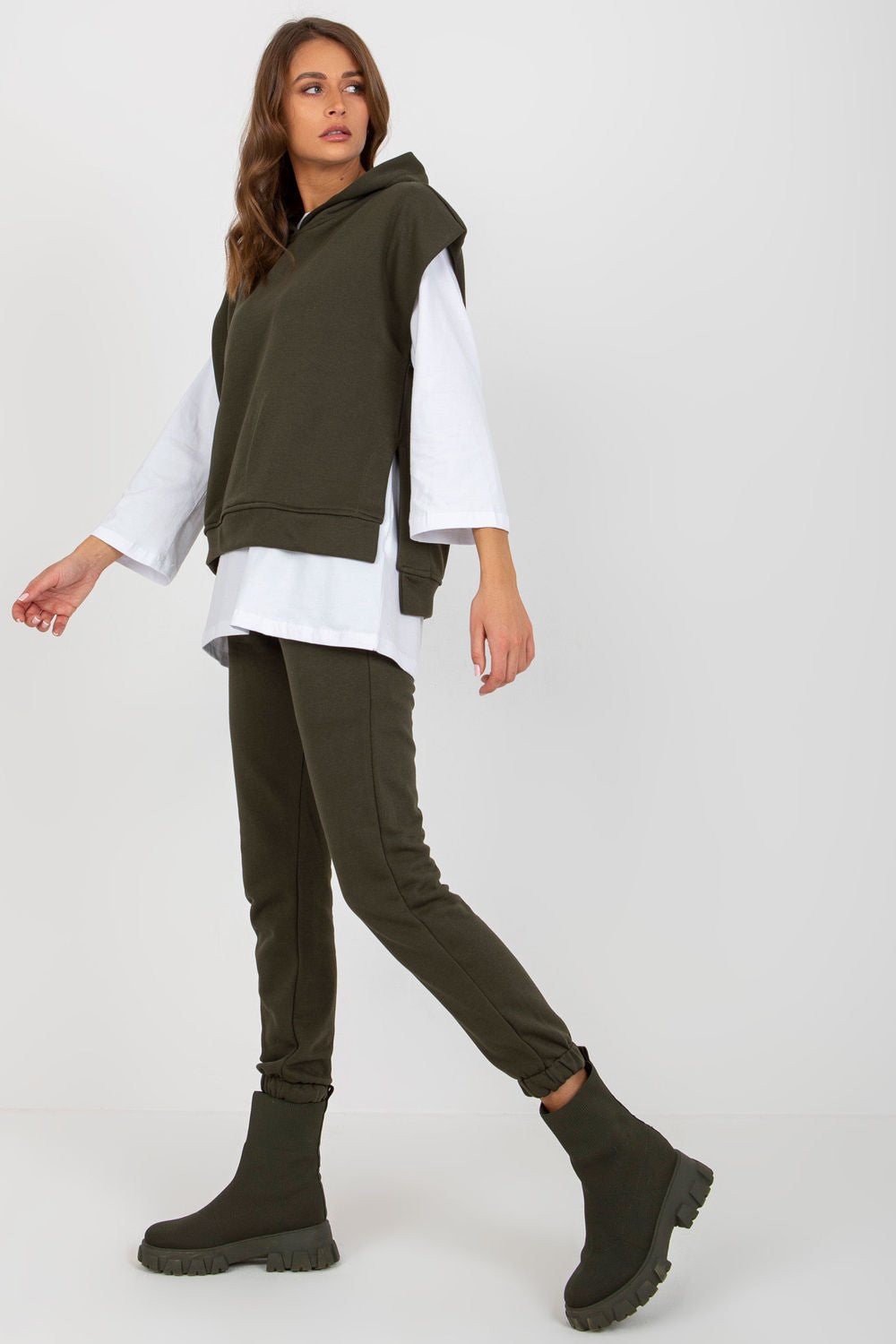 Conjunto deportivo compuesto por blusa, sudadera y pantalón. Blusa con mangas 3/4 y cuello redondo. Blusa con mangas cortas y capucha. Pantalón largo con lazo en la cintura y bolsillos laterales.