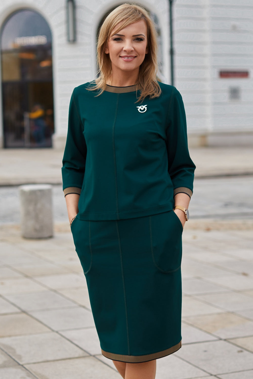 Este conjunto de dos piezas para mujer ha conquistado el corazón de nuestras clientas. Está confeccionado íntegramente en suave tejido de punto MORGAN. La parte superior tiene forma cuadrada y ribetes decorativos. La falda ligeramente ajustada con bolsillos le da un toque moderno. Un elástico ancho cosido en la cinturilla permite que la falda se ajuste perfectamente a la figura. La prenda está decorada con ribetes en la parte superior y la falda. Las costuras decorativas y un broche dorado también le dan un toque de atractivo. Este corte sofisticado ofrece comodidad a mujeres de todas las tallas. Totalmente sin forro.