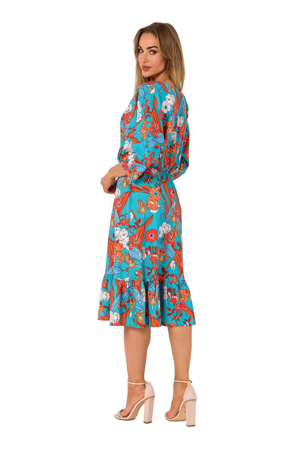 Vestido midi de verano con volante y escote redondo. Tiene mangas 3/4, cinturilla elástica, sin cierre ni forro.