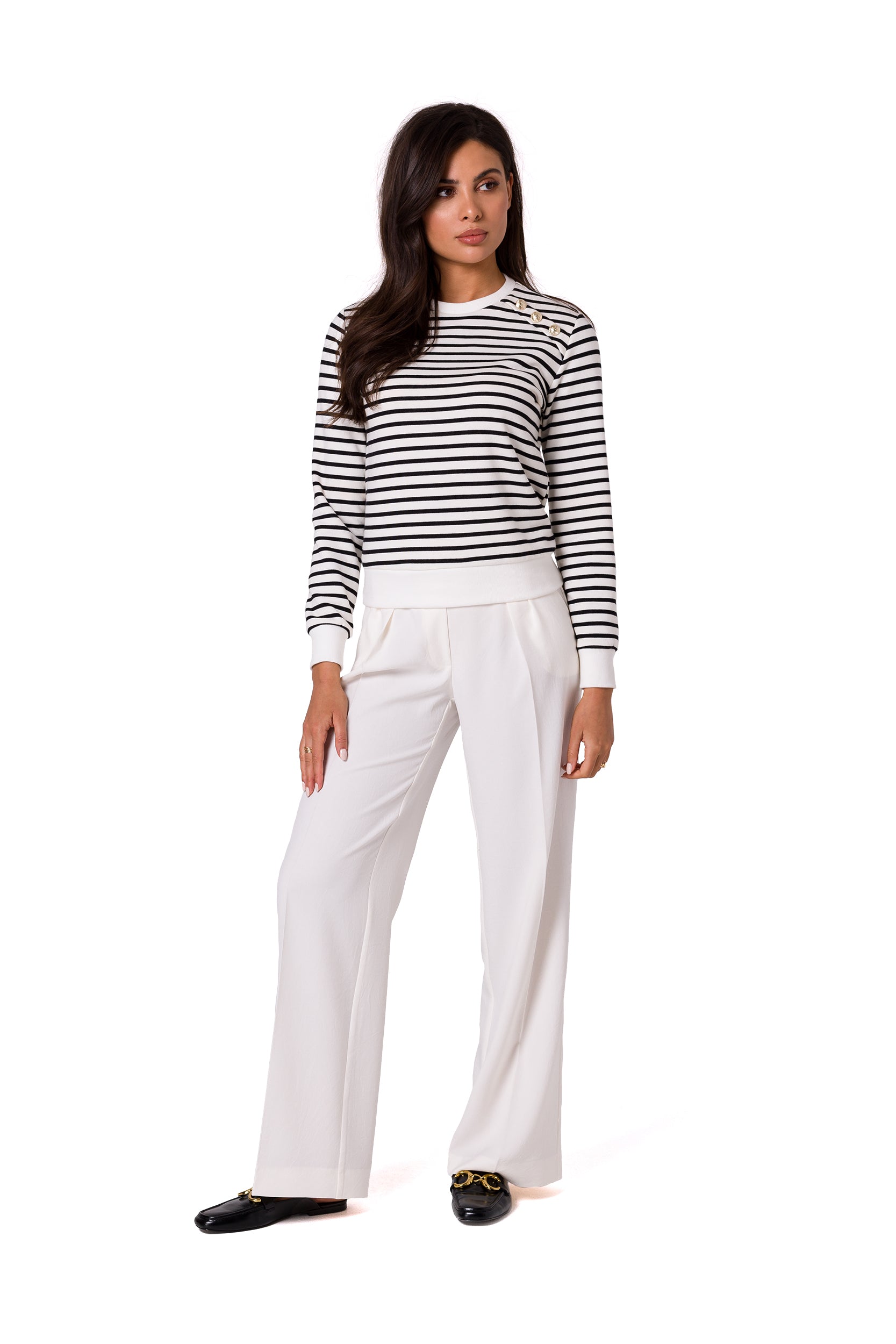 Esta sudadera de punto de algodón a rayas azul marino con botones dorados decorativos es la elegancia deportiva en su máxima expresión.