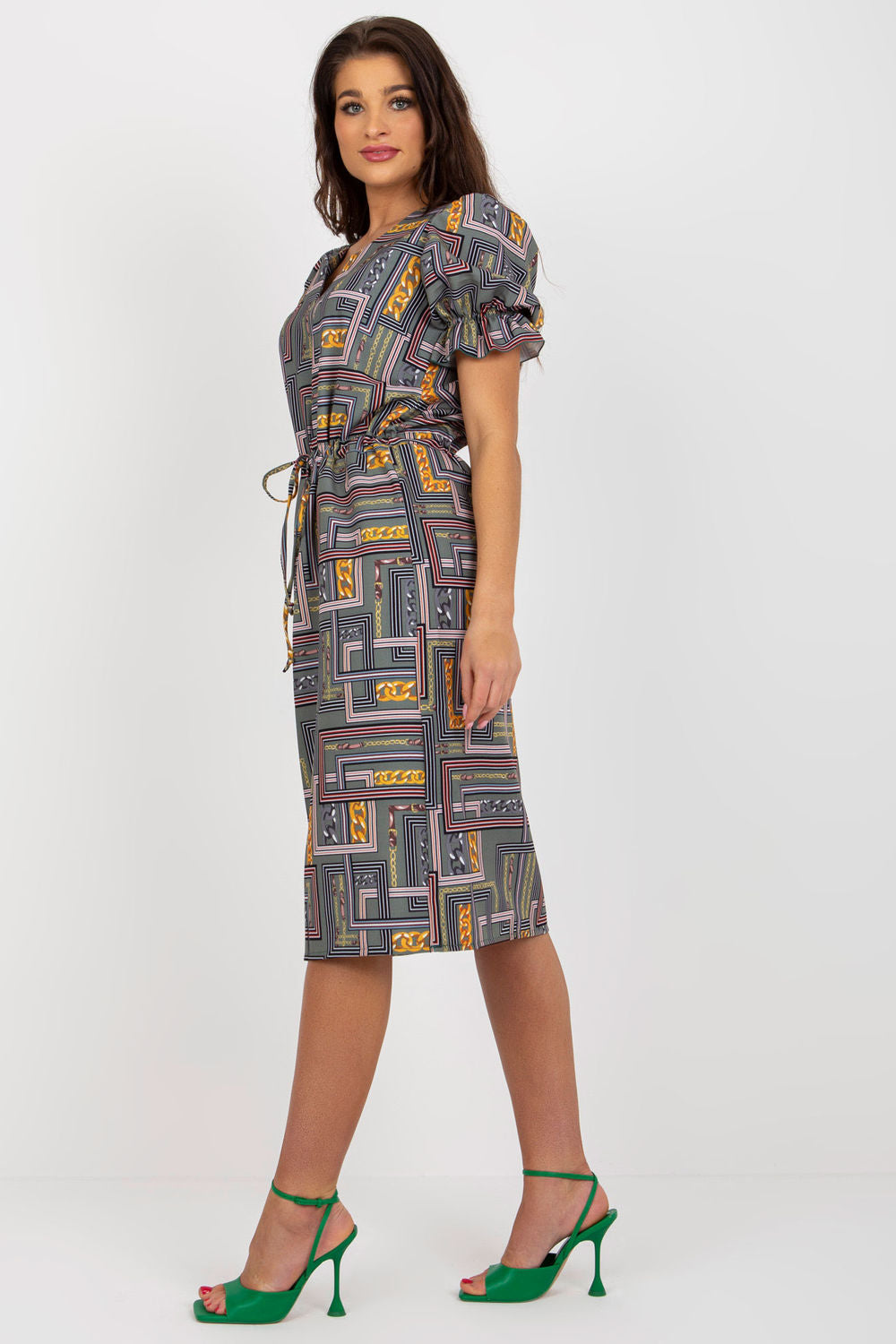 Vestido de manga corta y escote con abertura decorativa. Mangas abullonadas con lazo en la cintura.