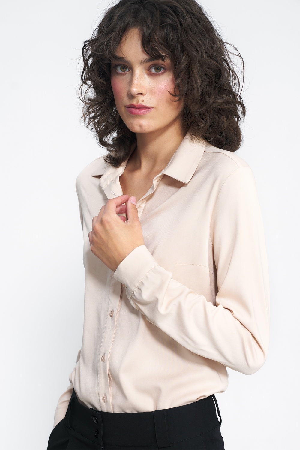 Esta delicada camisa beige le dará un toque chic a cualquier estilo. Combina a la perfección con pantalones y faldas. Este modelo puede ser la base de muchos conjuntos. Quedará genial con chaqueta y vaqueros. El color beige permite combinarla con cualquier otro color del resto del look.