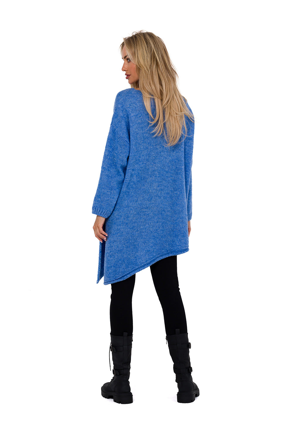 Suéter de mujer con corte asimétrico, confeccionado en hilo de trama suelta con pelo. Tiene mangas largas y escote en V. Presenta una abertura lateral. Diseñado y fabricado en Polonia.