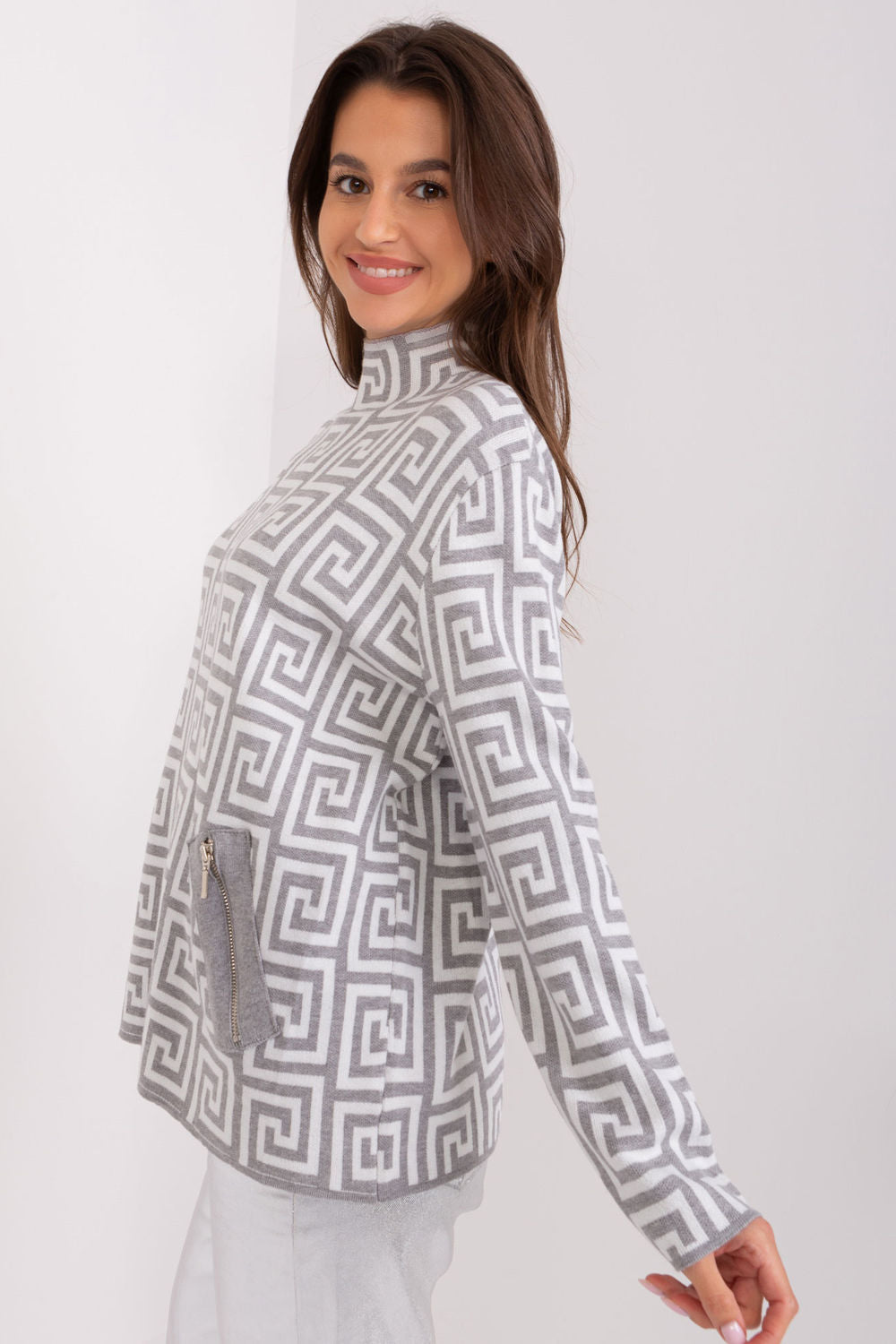Este suéter para mujer es la opción perfecta para el día a día y el trabajo. Su manga larga y su cuello alto brindan calidez y comodidad en los días más fríos. El suéter presenta un estampado geométrico que le aporta originalidad y estilo. Es una excelente opción para quienes aprecian un look moderno. Su largo es estándar, lo que lo hace ideal para muchos estilos diferentes. Además, los bolsillos con cremallera son prácticos para guardar objetos pequeños. Este suéter es ideal tanto para el día a día como para el trabajo, gracias a su estilo casual. Combina a la perfección la comodidad con un look moderno, convirtiéndolo en una prenda indispensable en el armario de cualquier mujer.