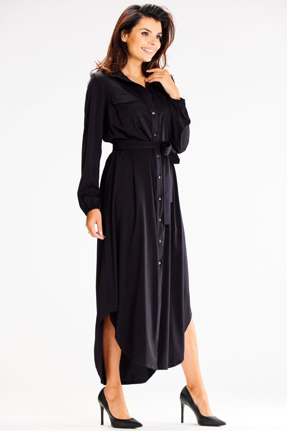Vestido maxi holgado, tipo camisa, de manga larga y abotonado. La parte delantera está decorada con amplios bolsillos y se ata a la cintura con un cinturón.