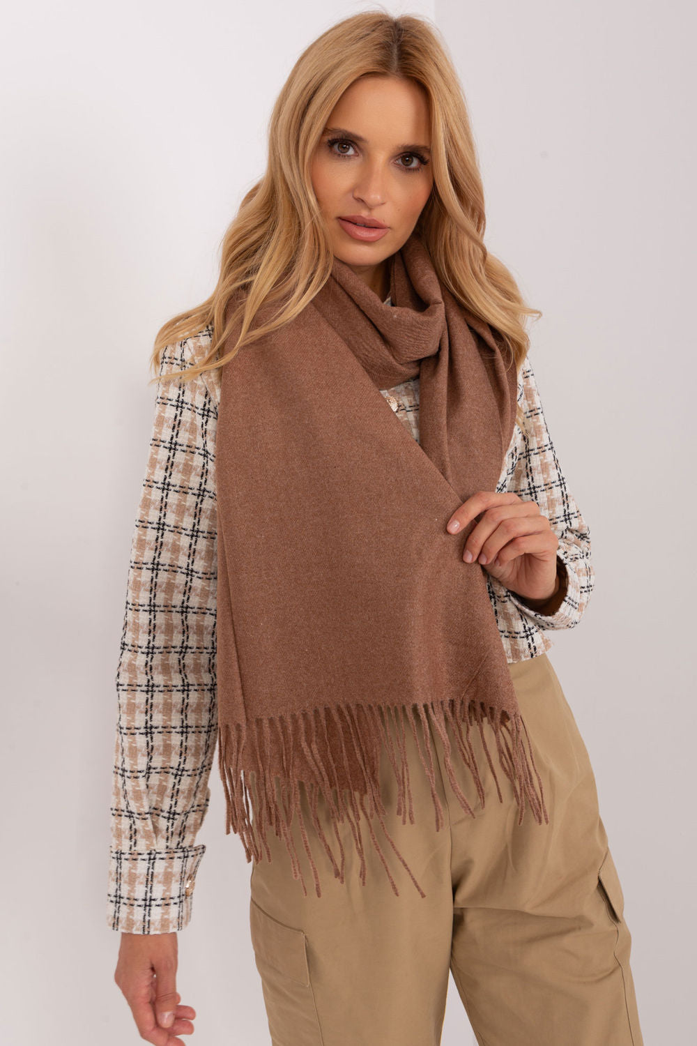 Cálida bufanda larga con borlas decorativas, ideal para el invierno.