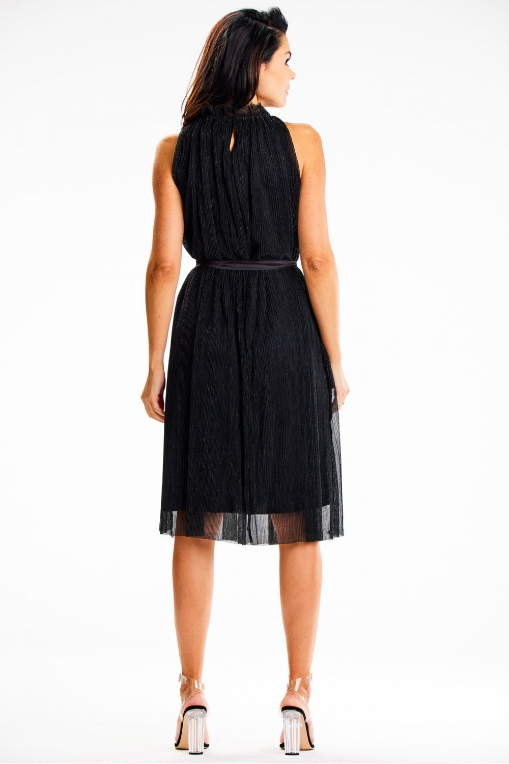 Vestido midi ligero con cuello decorativo y escote halter. Incluye un fino cinturón de satén. Confeccionado en malla brillante y forro de satén.