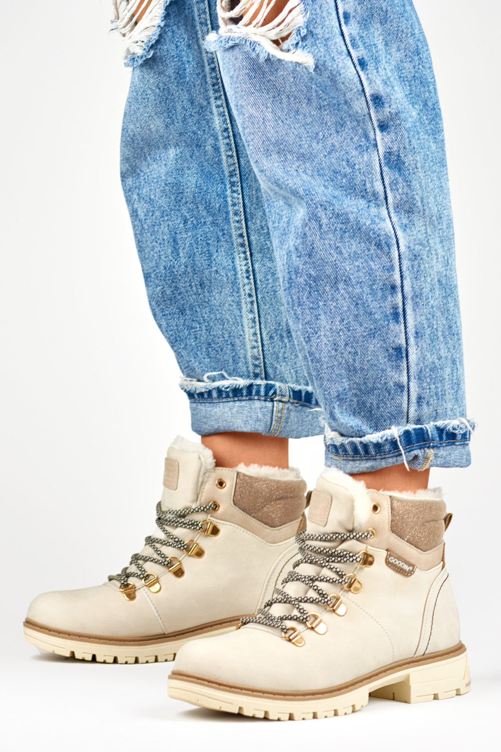 Estos elegantes tramperos en un suave tono beige son la elección perfecta para la temporada otoño/invierno. Diseñados pensando en las mujeres, combinan comodidad, funcionalidad y diseño de moda. La parte superior del calzado está hecha de cuero ecológico duradero, lo que le da a los zapatos un aspecto elegante. La altura de la caña de 11 cm proporciona una protección adicional contra el frío, ideal para los días de invierno. El interior de los tramperos está forrado con piel ecológica, lo que los hace extremadamente agradables y cálidos de llevar. El calentamiento adicional garantiza comodidad durante los días más fríos. Un pequeño tacón de 3 cm de altura añade un toque femenino a los zapatos, manteniéndolos estables. Los tramperos tienen cordones prácticos, que permiten una fácil personalización y garantizan un ajuste seguro. La punta redonda hace que estas botas sean cómodas y adecuadas para muchos conjuntos. El color beige les da versatilidad, permitiéndoles combinarlos fácilmente con una variedad de artículos de armario.