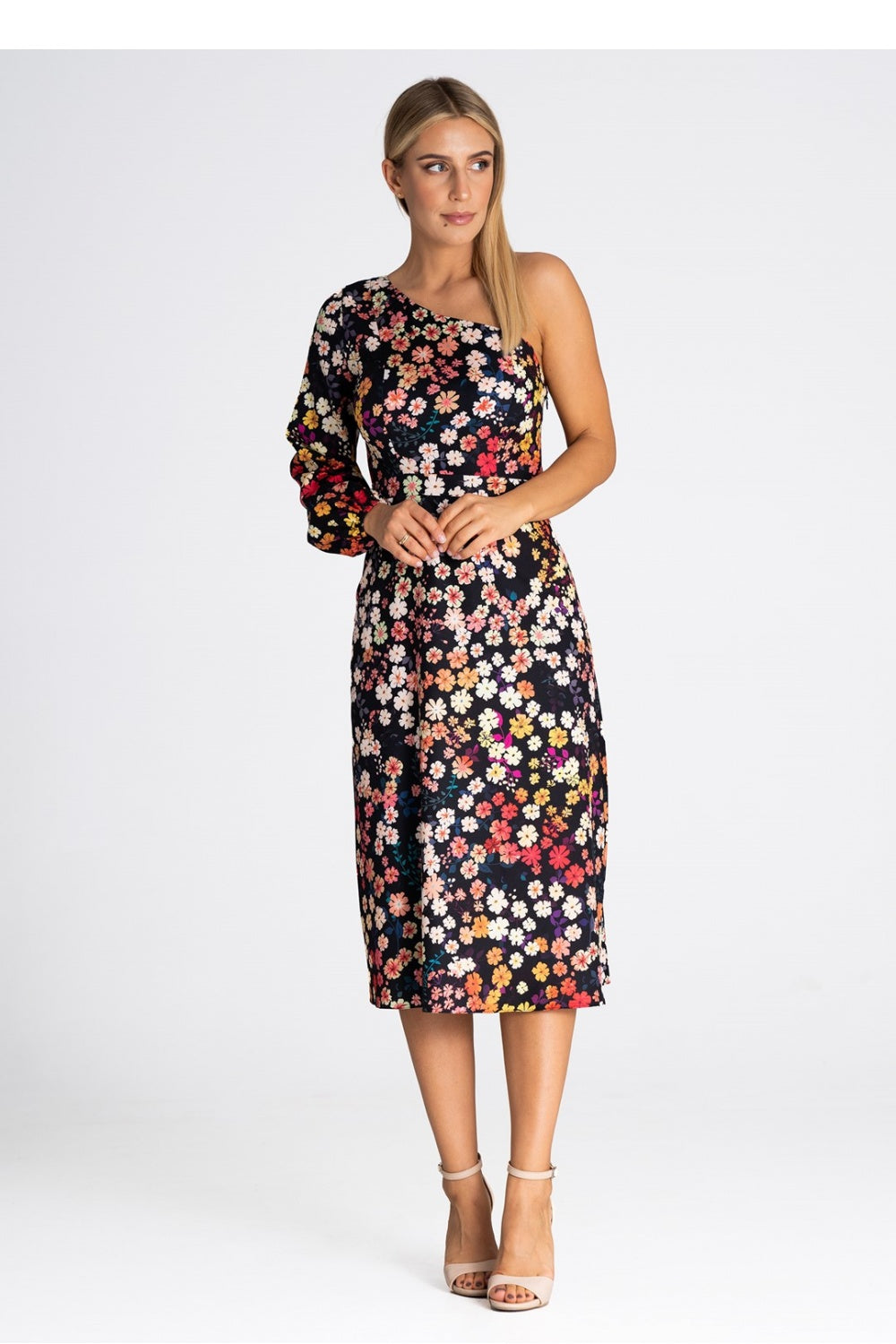 Vestido de un solo hombro. El bajo es ligeramente acampanado y tiene una abertura. Tiene una cremallera lateral. Tiene un corte claro en la cintura.