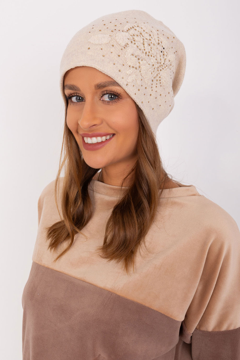 Cálido gorro de invierno para mujer con cachemir y aplicación decorativa de strass.