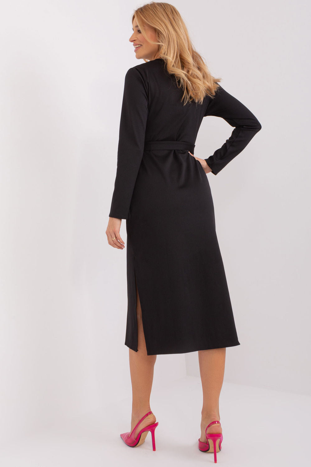Vestido de manga larga y escote corazón. Escote envolvente con entrelazo decorativo y cinturón de lazo. En la parte inferior, seductoras aberturas. El vestido está confeccionado en tejido acanalado. Una propuesta ideal para diversas ocasiones.