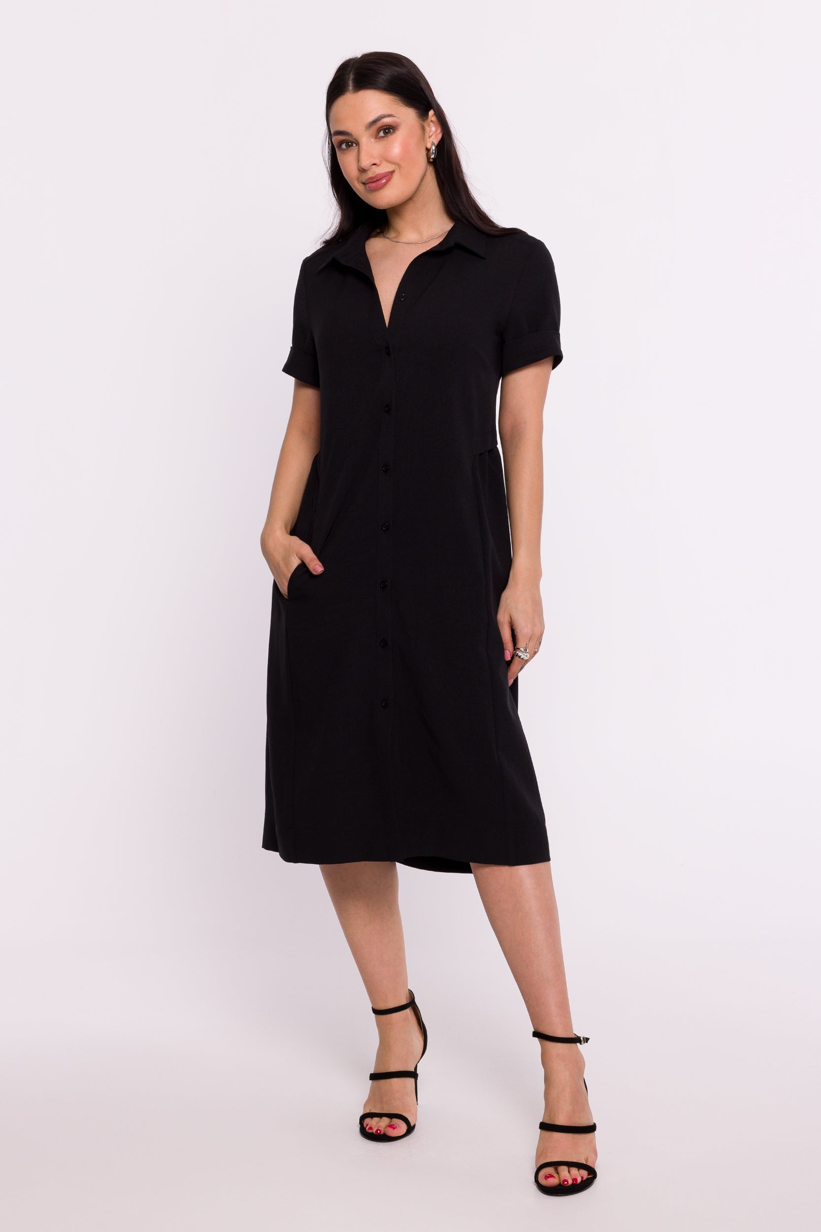 El vestido camisero combina lo clásico con la funcionalidad, confeccionado con tejidos de la más alta calidad. Este elegante modelo se presenta en forma de camisa de manga corta, perfecto para cualquier ocasión. La parte delantera del vestido está abotonada, lo que le aporta una sutil elegancia, y un elegante cuello bajo el cuello realza su sofisticación. Los bolsillos en las costuras delanteras no solo aportan un toque práctico, sino que también aportan un toque informal. Sin forro, este vestido es ligero y cómodo, perfecto para los días cálidos. Su largo por encima de la rodilla lo convierte en un modelo versátil que quedará bien tanto en el día a día como en ocasiones más formales. El diseño y la confección del vestido se realizan en Polonia, lo que demuestra el compromiso con el desarrollo de la moda nacional. Esto no solo expresa el carácter local, sino que también garantiza una confección de alta calidad. Este vestido camisero combina tradición, modernidad y comodidad, un reflejo perfecto del enfoque polaco de la moda.
