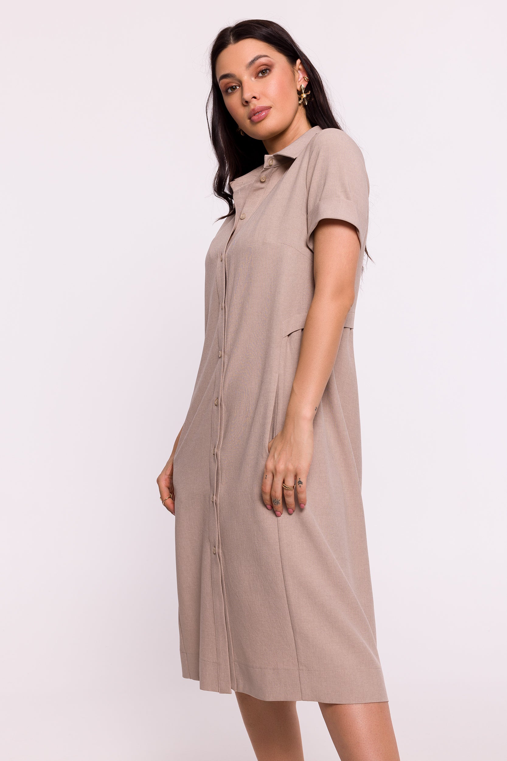 El vestido camisero combina lo clásico con la funcionalidad, confeccionado con tejidos de la más alta calidad. Este elegante modelo se presenta en forma de camisa de manga corta, perfecto para cualquier ocasión. La parte delantera del vestido está abotonada, lo que le aporta una sutil elegancia, y un elegante cuello bajo el cuello realza su sofisticación. Los bolsillos en las costuras delanteras no solo aportan un toque práctico, sino que también aportan un toque informal. Sin forro, este vestido es ligero y cómodo, perfecto para los días cálidos. Su largo por encima de la rodilla lo convierte en un modelo versátil que quedará bien tanto en el día a día como en ocasiones más formales. El diseño y la confección del vestido se realizan en Polonia, lo que demuestra el compromiso con el desarrollo de la moda nacional. Esto no solo expresa el carácter local, sino que también garantiza una confección de alta calidad. Este vestido camisero combina tradición, modernidad y comodidad, un reflejo perfecto del enfoque polaco de la moda.