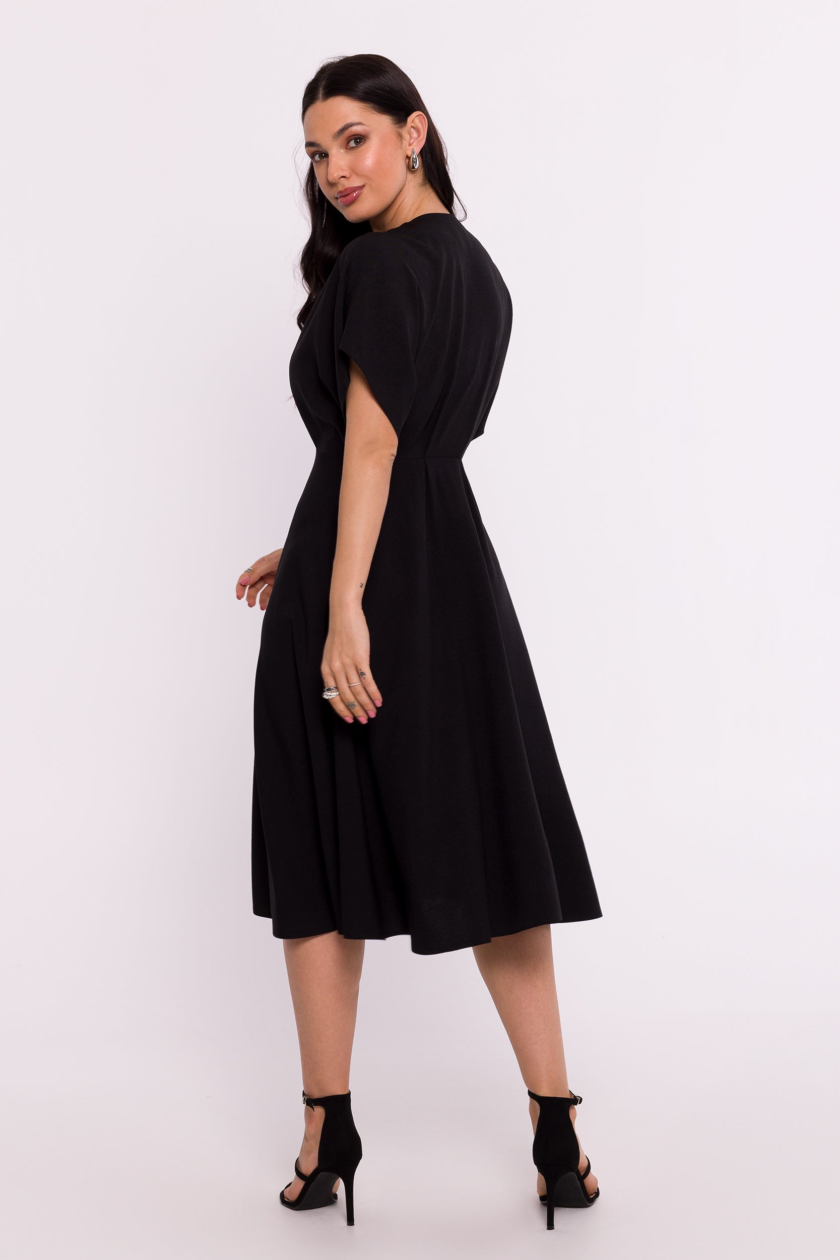 Este vestido de tela es una expresión de la artesanía del diseño polaco, que combina modernidad con una forma excepcional. El modelo, con escote envolvente, luce sumamente sensual, realzando la elegancia y la sutileza de quien lo luce. Las mangas cortas de murciélago aportan ligereza al vestido, otorgándole un carácter único y moderno. El bajo, acampanado y ligero, lo hace ideal para diversas ocasiones, creando un movimiento impactante a cada paso. Una cremallera oculta en el lateral le aporta elegancia y facilita su colocación. La ausencia de forro lo hace cómodo al tacto y perfecto para los días más cálidos. El diseño y la producción de esta prenda única se realizan en Polonia, lo que subraya el compromiso con el desarrollo de la industria de la moda nacional. Este vestido no es solo una opción de moda, sino también una expresión de orgullo por el diseño polaco, que combina modernidad, elegancia y alta calidad de confección.
