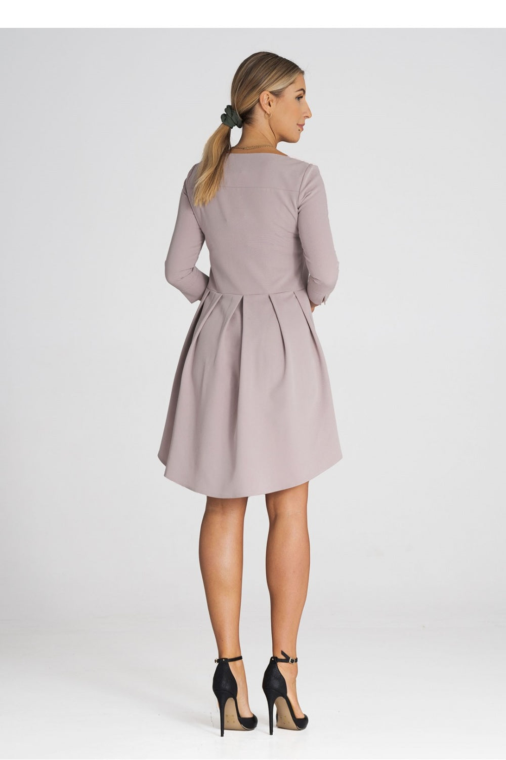 Elegante vestido asimétrico con mangas 3/4 y espalda plisada. No tiene bolsillos. Ideal para diversas ocasiones.