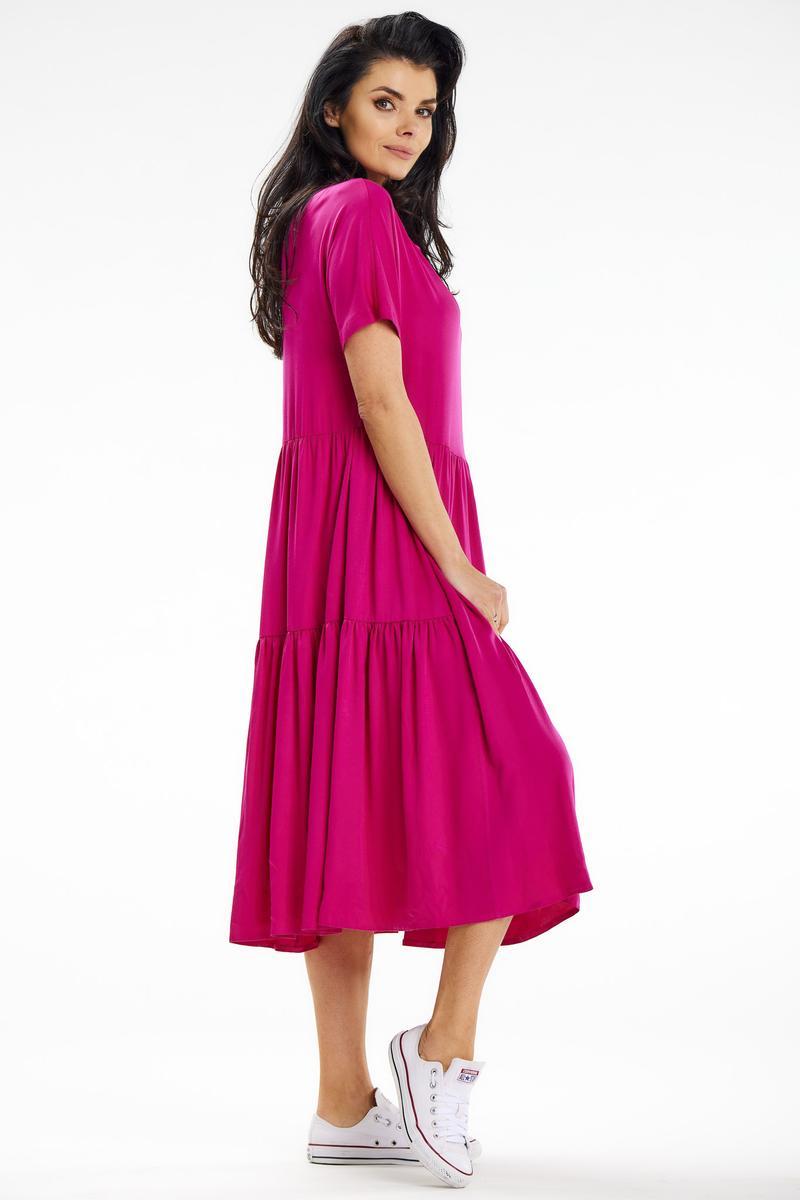 Vestido midi holgado de manga corta y escote barco. Los volantes le aportan ligereza y delicadeza. Es una propuesta para el verano. Gracias a su agradable tejido y su corte holgado, es ideal tanto para una reunión con amigos como para un paseo más largo.