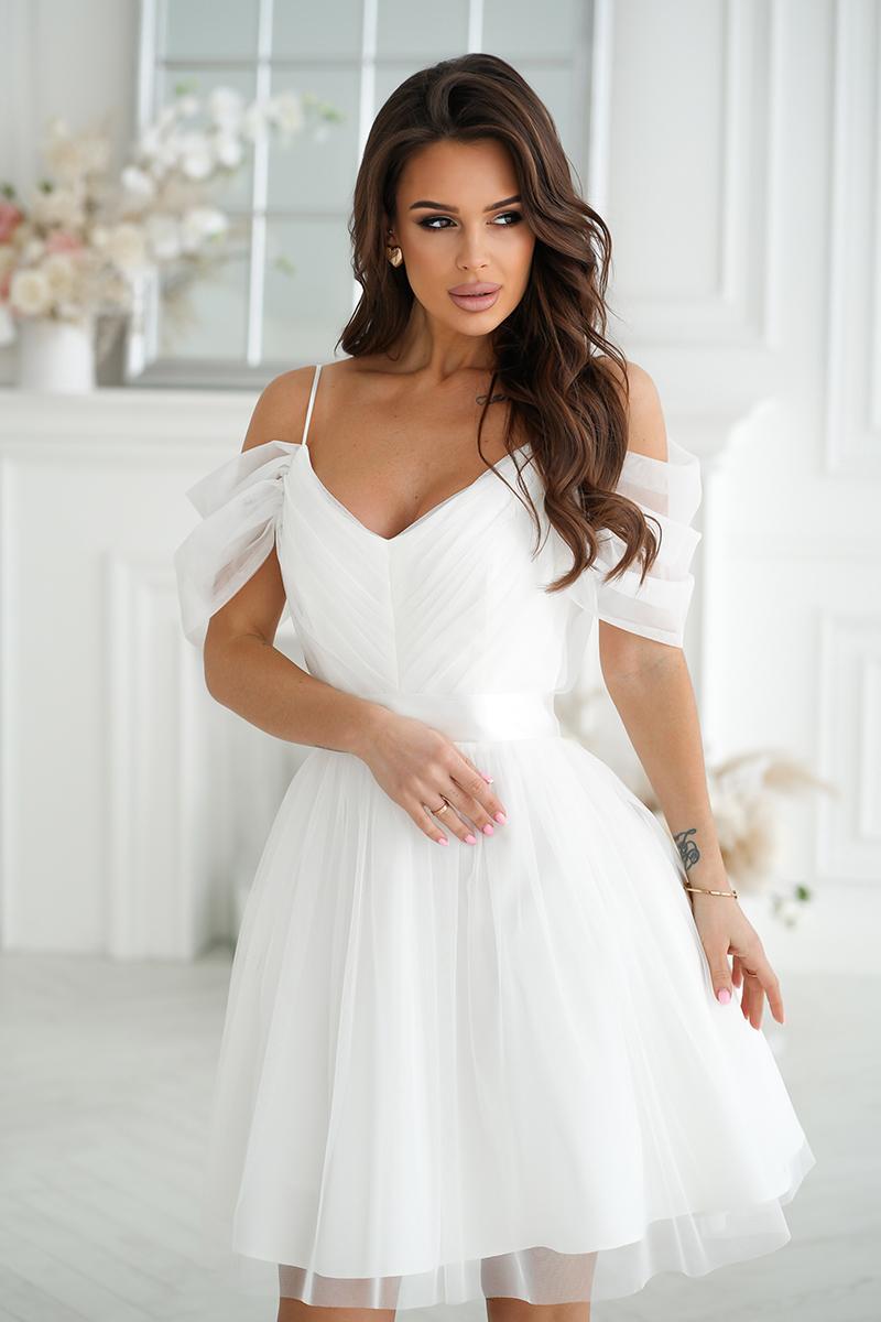 Precioso vestido de estilo español con mangas pronunciadas de tul. La parte inferior de la creación tiene capas y se ensancha, combinando perfectamente con la parte superior de la creación. Se adjunta un cinturón al modelo. El vestido se cierra con una cremallera cubierta. Disponible en colores jugosos.