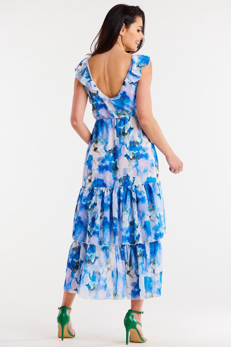 Vestido de gasa con forro elástico, decorado en la parte inferior con dos volantes y asimétrico. El escote de la espalda también está decorado con un volante y tiene un corte pronunciado. El vestido lleva un elástico cosido en la cintura para un ajuste ceñido.