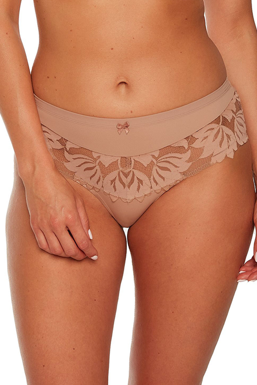 Braguitas Keto extremadamente femeninas con un corte clásico, confeccionadas con un bonito encaje y un tejido de punto liso. Un encantador lazo en la parte delantera.
