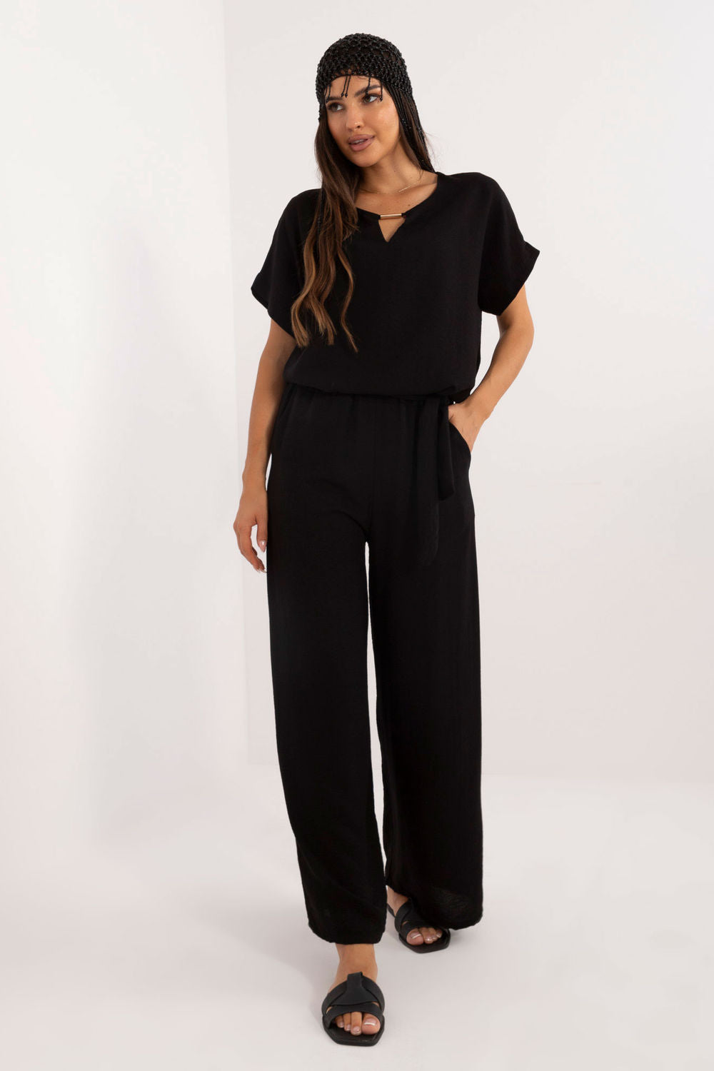 Este conjunto casual compuesto por blusa y pantalón es una opción ideal para el estilo diario y para el trabajo. Confeccionado en viscosa dominante, proporciona comodidad y transpirabilidad durante todo el día. El material liso en un color sólido le da al conjunto un carácter elegante pero informal. La blusa de manga corta y escote redondo combina perfectamente con pantalones largos de pernera ancha. Los pantalones de talle alto realzan la cintura, mientras que el cinturón anudado añade un toque elegante. Los prácticos bolsillos laterales aumentan la funcionalidad. Es un conjunto versátil que es perfecto para la oficina y el uso diario.