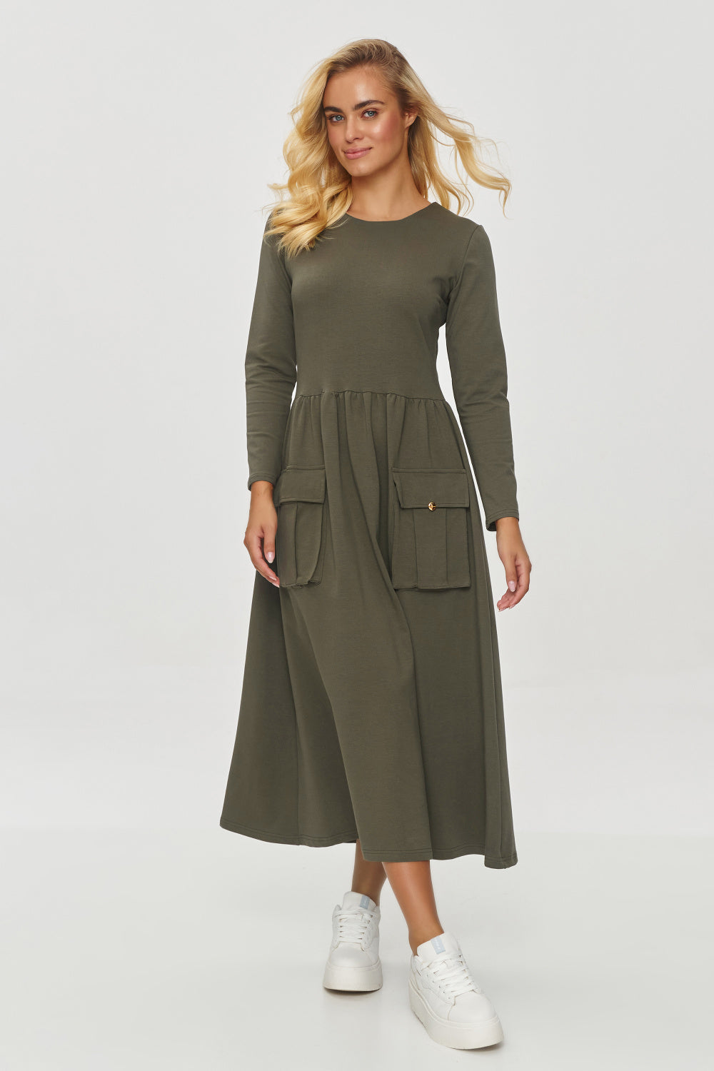 Un vestido acampanado es la opción perfecta para quienes valoran la combinación de estilo y funcionalidad. Este modelo presenta un corte clásico y femenino con largo midi y bajo acampanado. Está confeccionado en un material suave y cómodo, ideal para el día a día. Tiene mangas largas, ideal para los días más frescos. El corte en la cintura crea un sutil efecto arrugado que realza la silueta y le aporta encanto. Su elemento característico son los amplios bolsillos cosidos en la parte delantera, decorados con un elegante detalle dorado que no solo aporta estilo, sino que también cumple una función práctica. Este modelo combina comodidad y diseño moderno, lo que lo convierte en la opción ideal para diversas ocasiones.