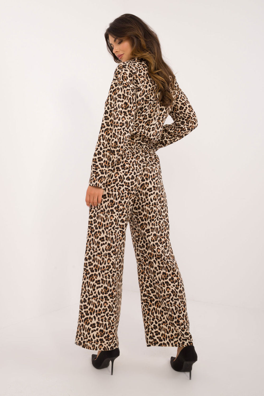 Conjunto para mujer con un moderno estampado animal, compuesto por camisa y pantalón, confeccionado en una combinación de poliéster y elastano. La camisa tiene mangas largas y está abotonada, lo que le confiere un carácter clásico. Además, cuenta con un cuello que realza su elegancia. Los pantalones son largos y anchos, lo que proporciona comodidad y libertad de movimiento. La cintura alta realza la silueta, aportando refinamiento al conjunto. Este conjunto es perfecto para mujeres que valoran la moda, la comodidad y un toque de estilo depredador en su look diario.