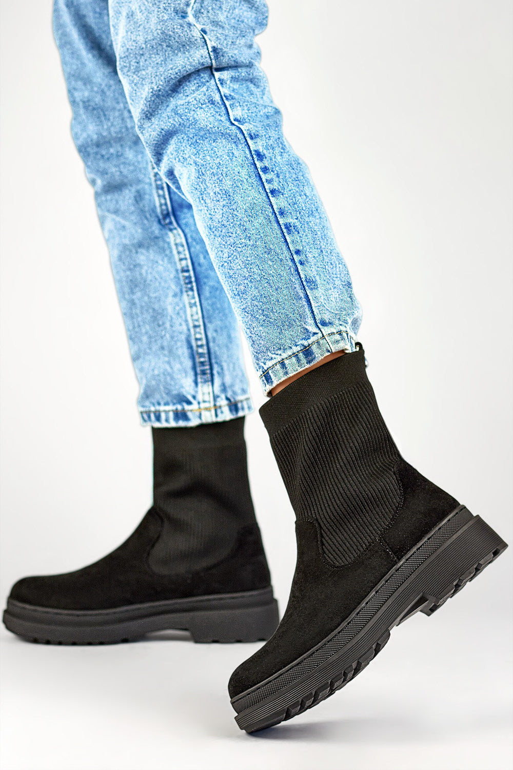 Elegantes botas negras confeccionadas en ante ecológico, perfectas para la temporada otoño-invierno. La parte superior alta de 15 cm aumenta su apariencia esbelta, mientras que el aislamiento de piel y la plantilla de piel ecológica brindan comodidad y calidez. Las botas con un tacón bajo de 5 cm combinan comodidad con elegancia y el diseño sin cordones hace que sean fáciles de poner y quitar. La puntera redonda les confiere un carácter clásico y atemporal que encaja perfectamente en el estilismo invernal.