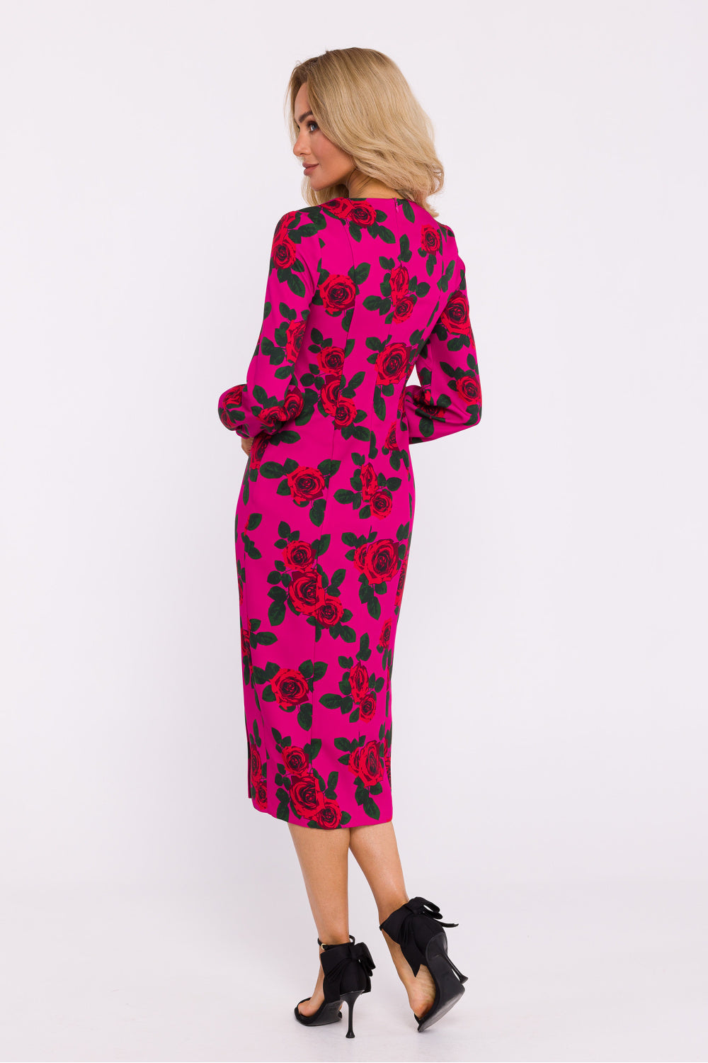 Un vestido midi, confeccionado en tejido estampado, con un corte ajustado que realza la silueta. El escote carmesí le aporta elegancia y deja el escote sutilmente al descubierto. Las mangas largas y abullonadas, rematadas con puños y abrochados con un botón forrado, le aportan un toque romántico. Una abertura alta en la parte delantera le da un toque sensual, mientras que una cremallera forrada en la espalda garantiza un cierre discreto. El vestido no tiene forro, lo que lo hace ligero y cómodo de llevar. Diseñado y confeccionado en Polonia, destaca por su alta calidad de confección y su diseño original.