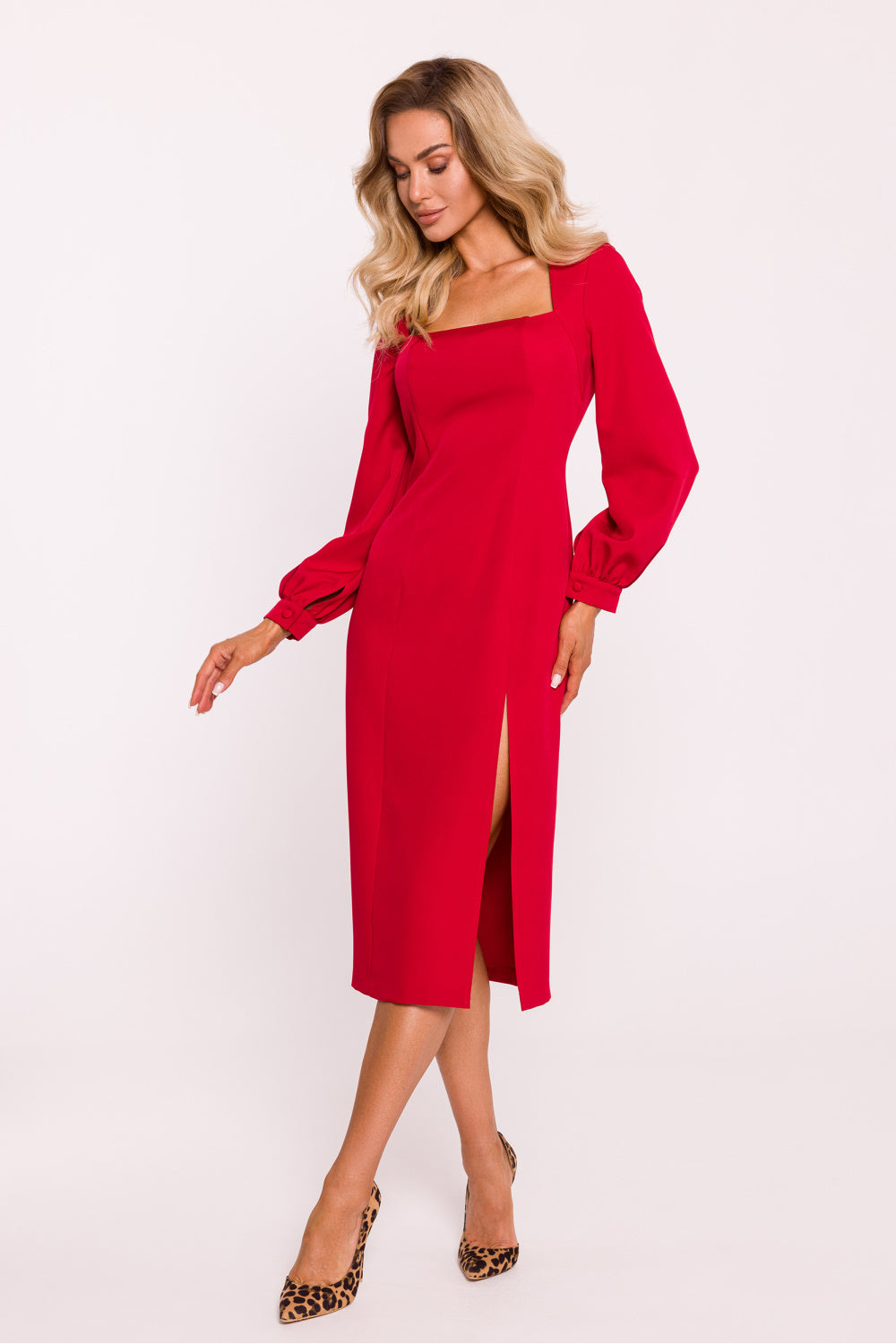 Un vestido midi confeccionado en tejido monocromático, con un corte entallado que realza la figura a la perfección. Un elegante escote carmesí le aporta un encanto clásico, mientras que las mangas largas tipo bufé con puños con botones ocultos aportan un toque romántico y moderno. Una abertura alta en la parte delantera aporta un detalle sensual, mientras que una cremallera oculta en la espalda garantiza un ajuste cómodo. El modelo no tiene forro, lo que lo hace más ligero e ideal para diversas ocasiones. El vestido fue diseñado y confeccionado en Polonia, lo que garantiza una alta calidad y una confección impecable.