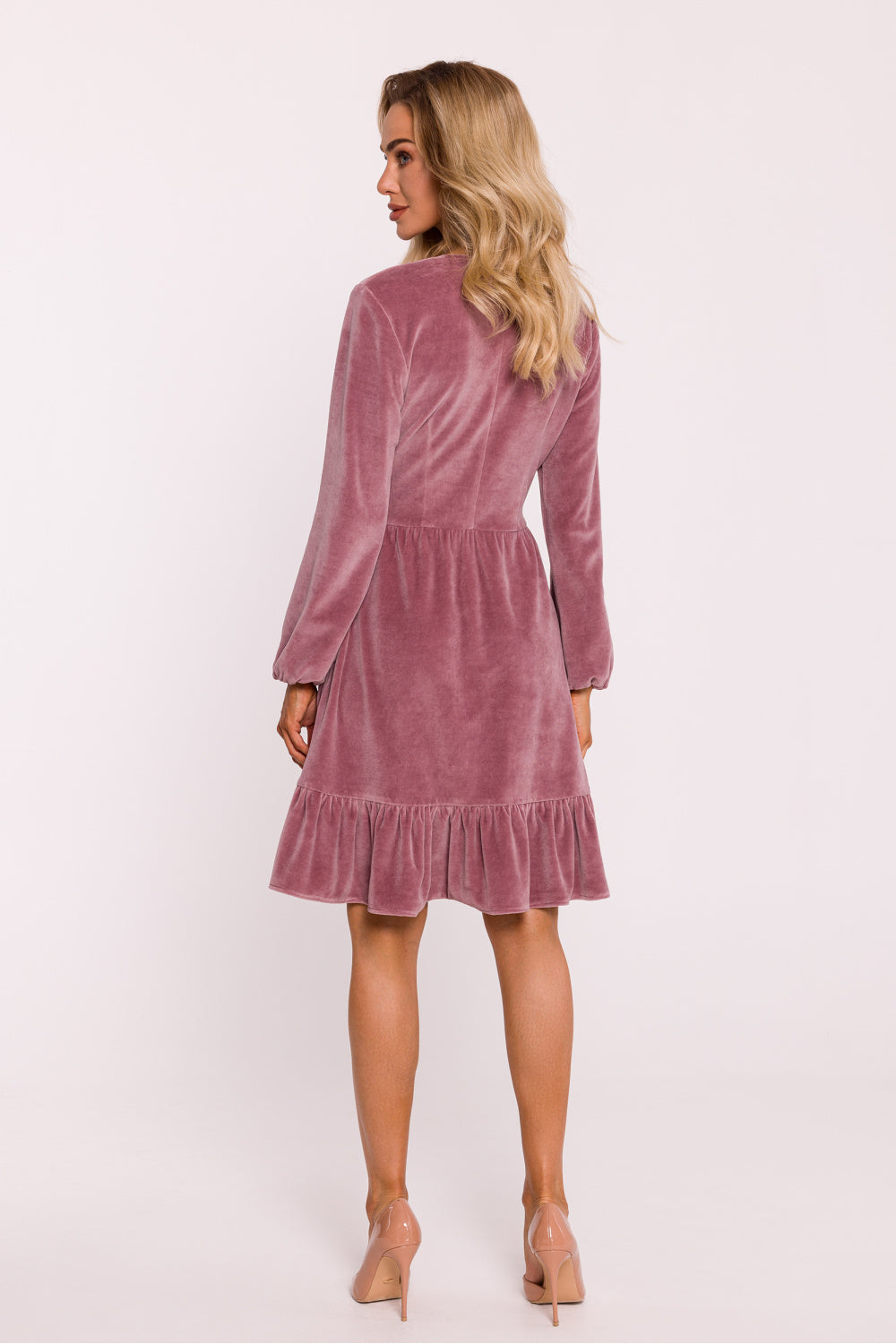 Elegante vestido confeccionado en suave punto de terciopelo que combina elegancia y comodidad. Este modelo, con cintura marcada que realza la silueta femenina, y un pronunciado escote en V, le aporta sensualidad. Las mangas largas tipo bufé, rematadas con elástico, le confieren un carácter romántico y ligereza. El bajo es ligeramente evasé y está rematado con un volante que aporta sutil movimiento y elegancia. Su largo por debajo de la rodilla lo hace ideal para diversas ocasiones. Una cremallera lateral oculta proporciona un cierre práctico, y la ausencia de forro lo hace ligero y cómodo. Diseñado y confeccionado en Polonia, este vestido es una excelente opción para quienes buscan combinar un look moderno con comodidad, tanto para el día a día como para eventos especiales.
