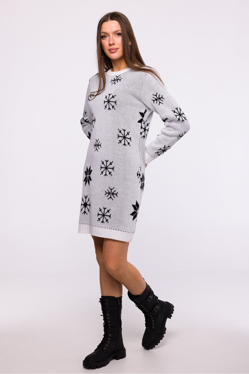 Vestido suéter de corte sencillo, confeccionado con hilo acrílico de alta calidad, brinda suavidad y comodidad al usarlo. El modelo de manga larga rematado con puño entallado, que realza las muñecas y aporta un toque elegante. El escote garantiza calidez y un look clásico, perfecto para los días más fríos. El estampado navideño le da al vestido encanto y un carácter único, creando un conjunto perfecto para las festividades de invierno. El producto fue diseñado y producido en Polonia, destacando su calidad y atención al detalle.