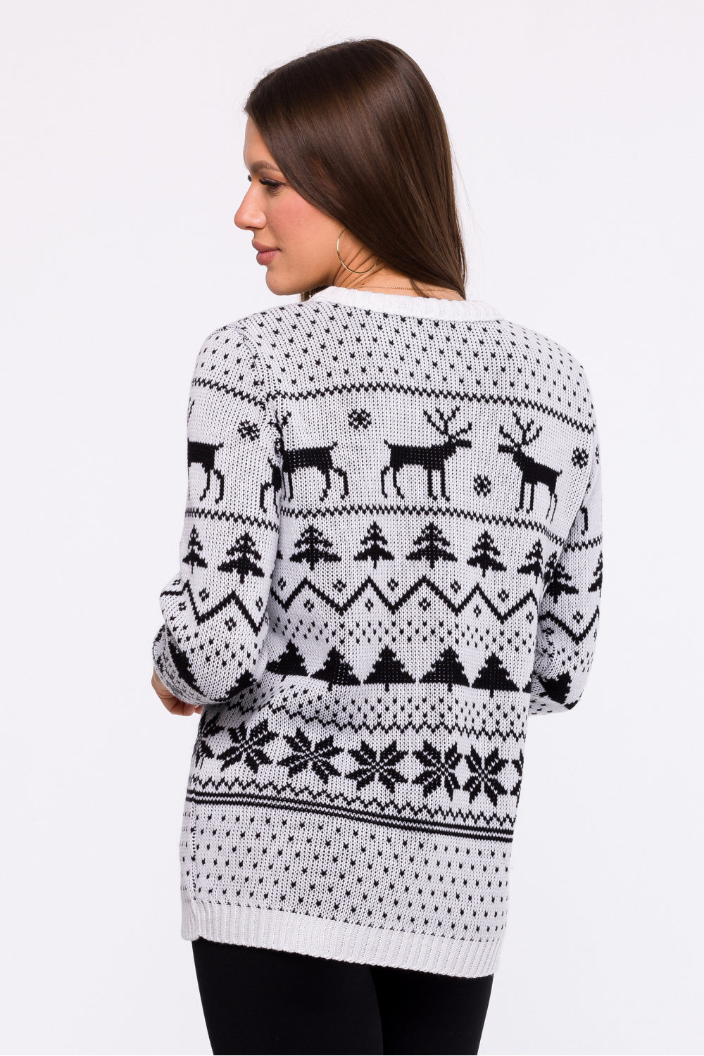 Jersey navideño de corte sencillo, confeccionado en hilo acrílico de agradable tacto, que garantiza comodidad y calidez en los días más fríos. Tiene mangas largas rematadas en puño, que se ajusta bien a las muñecas, aportando elegancia y comodidad. Un escote clásico y un estampado festivo crean un conjunto armonioso que funcionará perfectamente durante las ocasiones invernales y aportará un ambiente festivo. El suéter fue diseñado y producido en Polonia, lo que demuestra atención a cada detalle y mano de obra de alta calidad.