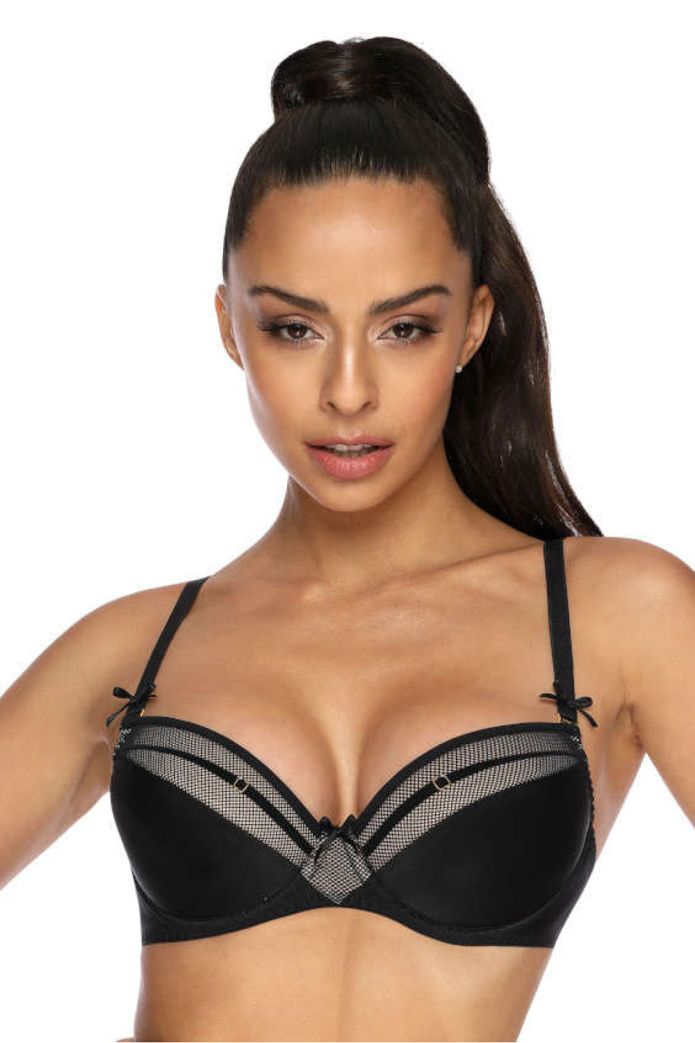 El sensual sujetador push-up Janet expone maravillosamente el busto, recogiéndolo hacia adentro Y agrandándolo ópticamente. Impresionantes inserciones de delicada malla en las copas y el puente. Las copas están decoradas además con correas con hebillas. Lazos decorativos en los tirantes y en la conexión. Correas ajustables y desmontables. Gancho y ojo de dos filas con ajuste de tres pasos.