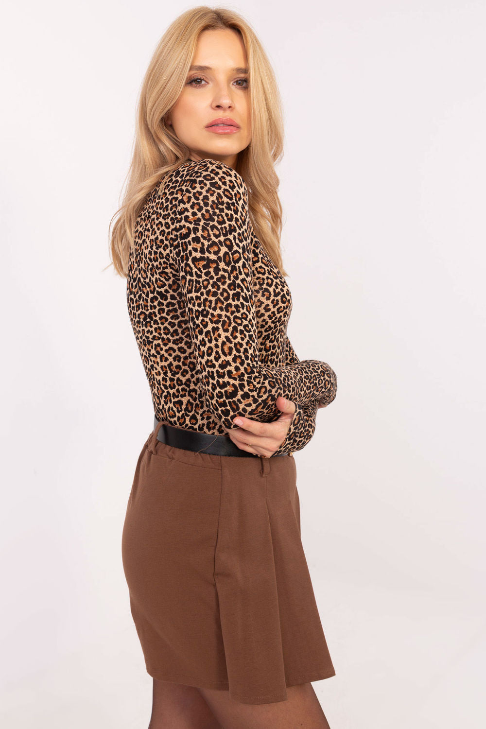 Una elegante blusa con estampado animal es una excelente opción tanto para el día a día como para el trabajo. Fabricada con un material dominante, una combinación de viscosa y elastano, garantiza comodidad y un ajuste perfecto. La blusa tiene un largo estándar, mangas largas y cuello redondo, lo que le da un carácter versátil. Al no tener broche, es fácil de poner y quitar. Es una prenda ideal para un estilo casual, que combina looks modernos con practicidad.